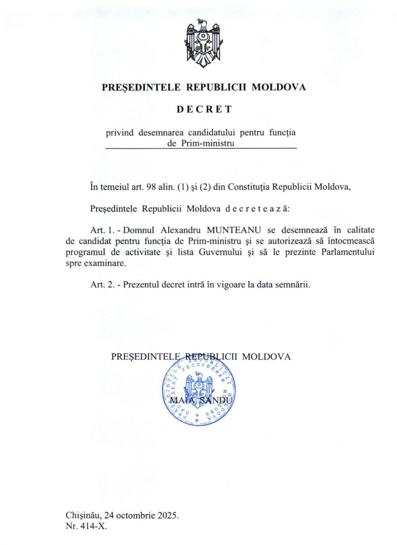 "Following consultations with the parliamentary factions, I signed today the decree by which I designated Mr. Alexandru Munteanu as a candidate for the position of Prime Minister of the Republic of Moldova", announced the head of state.