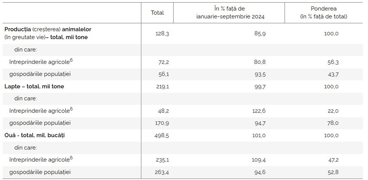 În cazul ouălor, producția este în scădere cu 5.4% în gospodăriile populației, dar, pe fundalul unei creșteri de 9.4% în întreprinderile agricole, s-a înregistrat o creștere totală de 1%.