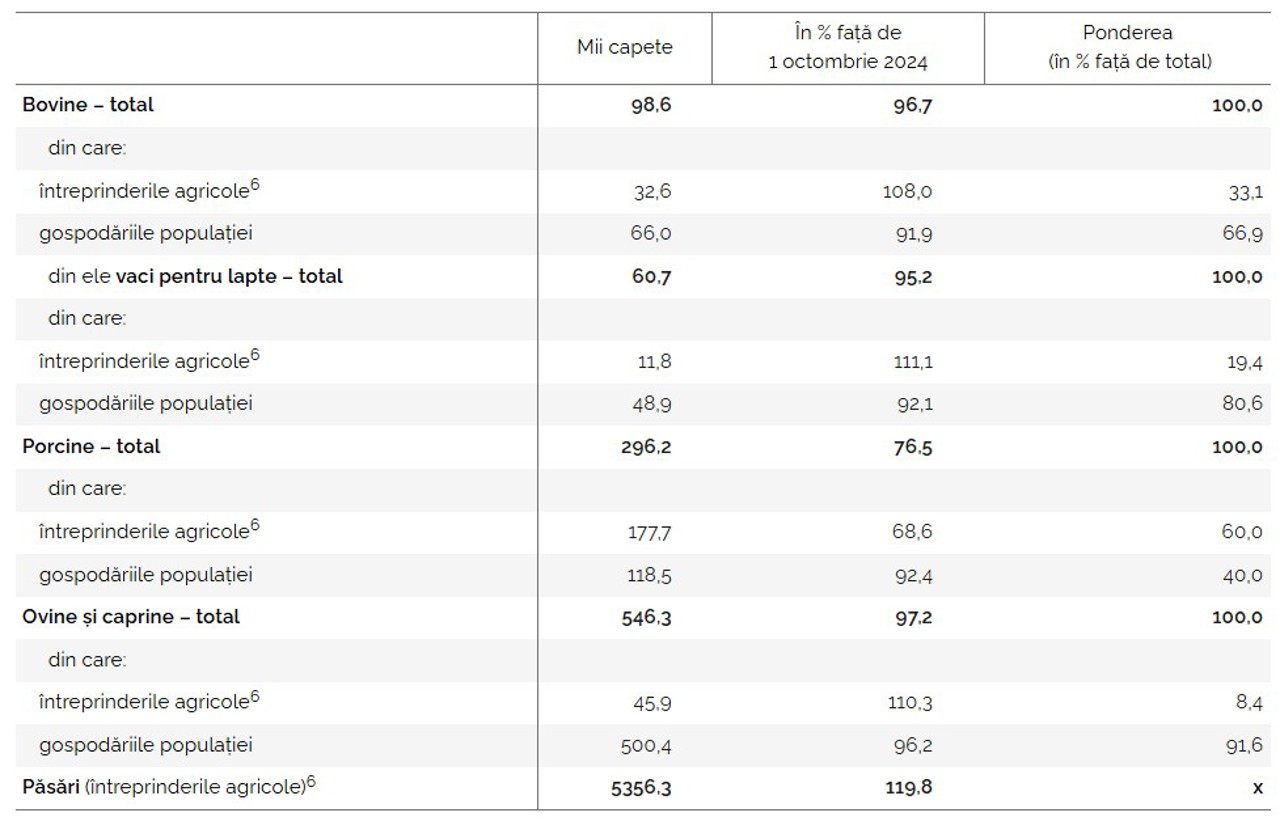Per ansamblu, efectivul de animale este în ușoară creștere, însă nu și în gospodăriile populației, unde se înregistrează scăderi la toate speciile.