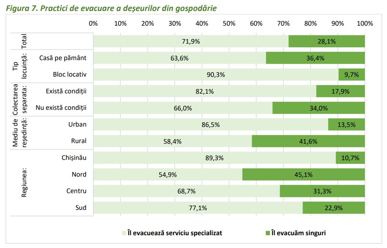 Potrivit sondajului, aproximativ 72% dintre gospodăriile din R. Moldova beneficiază de un serviciu specializat de colectare și evacuare a deșeurilor, în timp ce 28% își gestionează singure deșeurile, adesea prin metode informale precum arderea sau depozitarea la gunoiști comune.