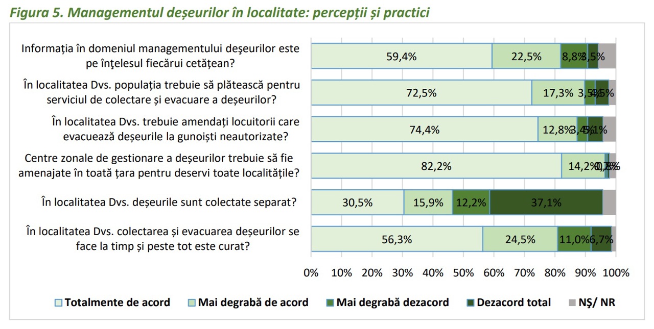 Deși 80% dintre cetățeni consideră că evacuarea se face la timp și localitățile sunt curate, jumătate dintre respondenți spun că nu se practică colectarea separată a deșeurilor în comunitatea lor.