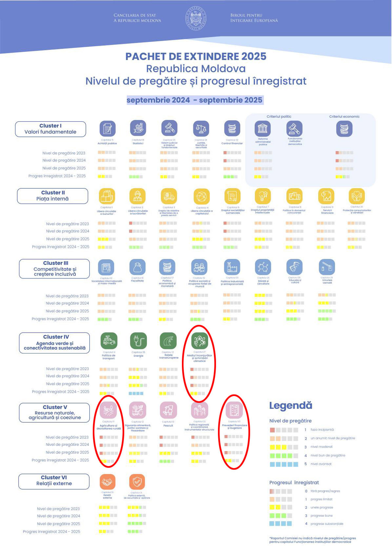 Republica Moldova a făcut pași importanți pe calea alinierii la standardele europene, dar există trei domenii aflate încă în „fază incipientă”, deși în ultimul an au fost realizate „unele progrese”. Este vorba despre capitolele 27, 11 și 33 din clusterele IV și V de negocieri - Mediu și schimbările climatice, Agricultură și dezvoltare rurală și, respectiv, Dispoziții financiare și bugetare, potrivit ultimului raport de extindere, aprobat pe 4 noiembrie de Comisia Europeană.