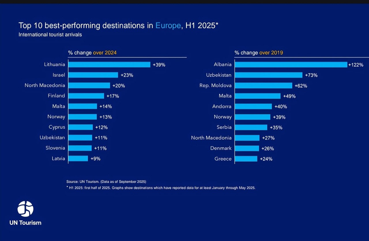 Republica Moldova se numără printre cele mai dinamice destinații turistice din Europa, potrivit datelor publicate de Organizația Mondială a Turismului (UN Tourism). În prima jumătate a anului 2025, țara noastră s-a clasat în Top 10 destinații europene cu cele mai bune performanțe, înregistrând o creștere de 62% a sosirilor internaționale de turiști comparativ cu perioada pre-pandemică din 2019.