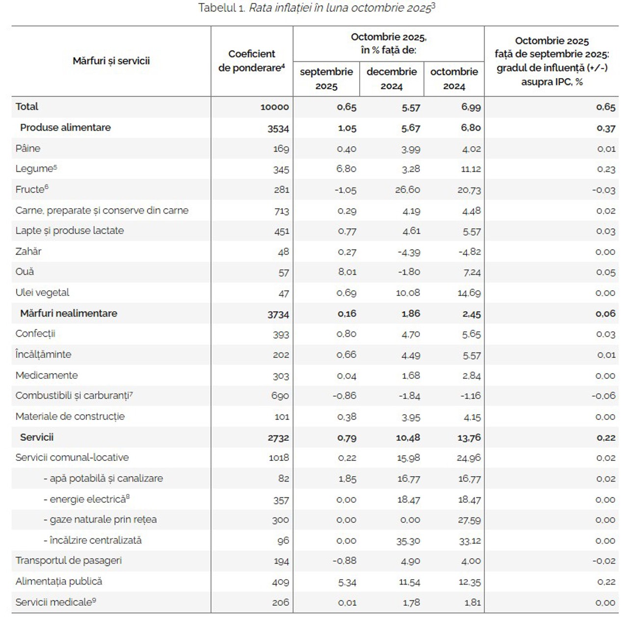 Comparativ cu octombrie 2024, prețurile alimentelor au crescut cu 6.8% - la cele nealimentare cu 2.5%, iar la servicii cu 13.8%.