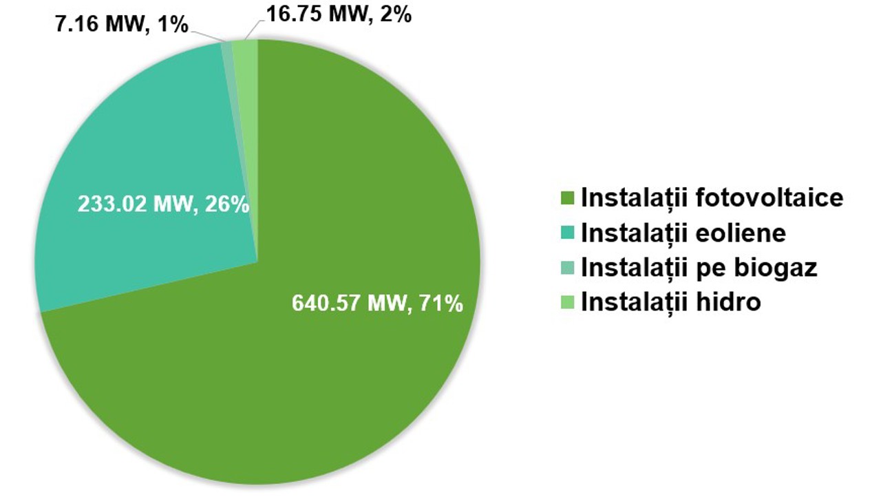 Instalațiile eoliene, a căror putere sumară a atins 233.02 MW, reprezintă 26% din total. Iar capacitățile instalațiilor hidro și biogaz înregistrează împreună ponderi sub 3% din total: 16.75 MW și, respectiv, 7.16 MW.