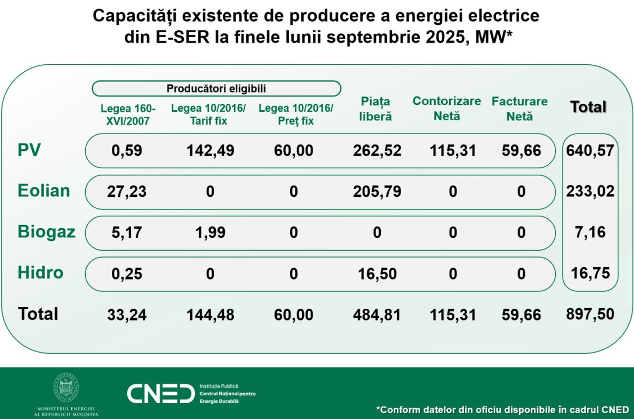 „În total, prin mecanismele de sprijin adoptate de stat sunt instalate 412.69 MW, ceea ce constituie o pondere de 46% din capacitatea totală existentă de producere a energiei electrice din surse regenerabile”, precizează un comunicat de presă al CNED.