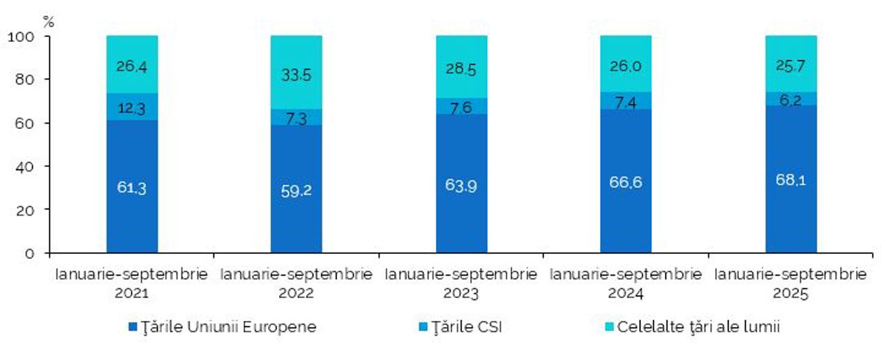 În ianuarie - septembrie curent, exporturile către UE au însumat 1.79 de miliarde de dolari, ceea ce reprezintă 68,1% din total și o creștere de 2.5% față de anul trecut.
