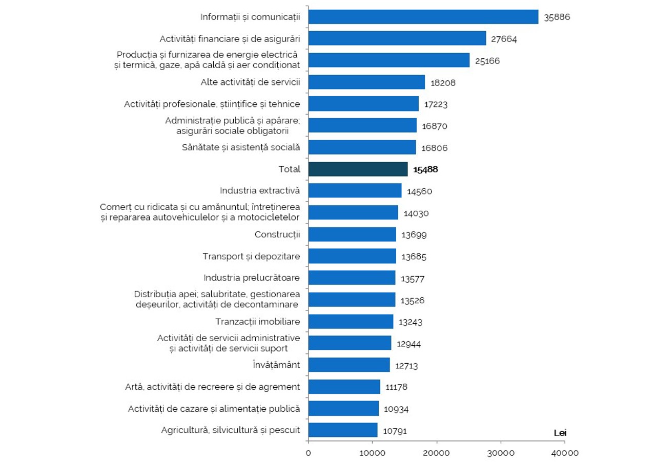 Cele mai mari salarii medii lunare au fost înregistrate în domeniul informațiilor și comunicațiilor – 35.886 de lei.
