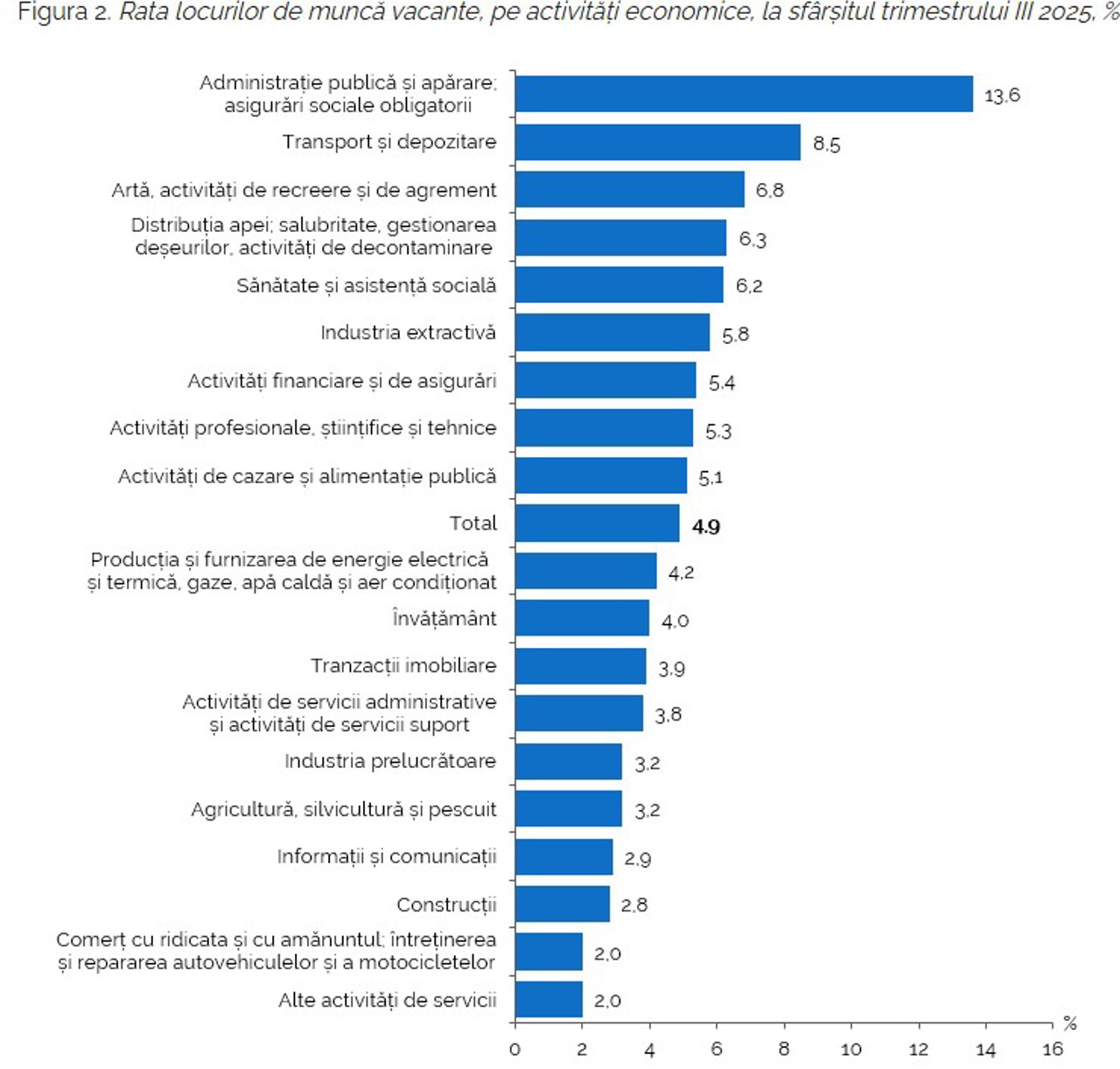 Conform datelor prezentate de BNS, cele mai multe posturi vacante au fost în administrație publică, apărare, asigurări sociale obligatorii - numărul acestora fiind de peste opt mii, sănătate și asistență socială - 4.6 mii de posturi vacante, în învățământ numărul fiind de patru mii de locuri de muncă.