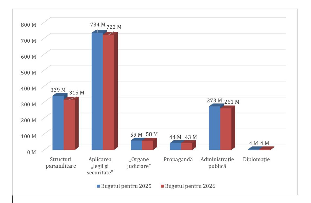 Aproape 26.5% din buget sunt direcționate spre pretinsele structuri de forță, administrație, diplomație și presa controlată.