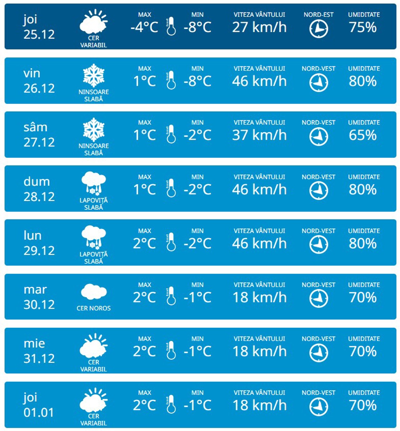 Conform datelor meteorologilor, în noaptea de joi spre vineri, 26 decembrie, termometrele vor fi de până la minus 8 grade, iar în următoarele nopți vor oscila între minus 1 și minus 2 grade. Ziua vor fi 1-2 grade Celsius.