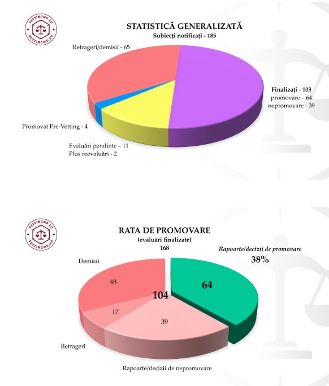 Până în prezent, Comisia de Evaluare a Judecătorilor a demarat vetting-ul în privința a 185 de subiecți, dintre care 65 au demisionat ori s-au retras, iar alți patru au promovat anterior evaluarea de tip pre-vetting.