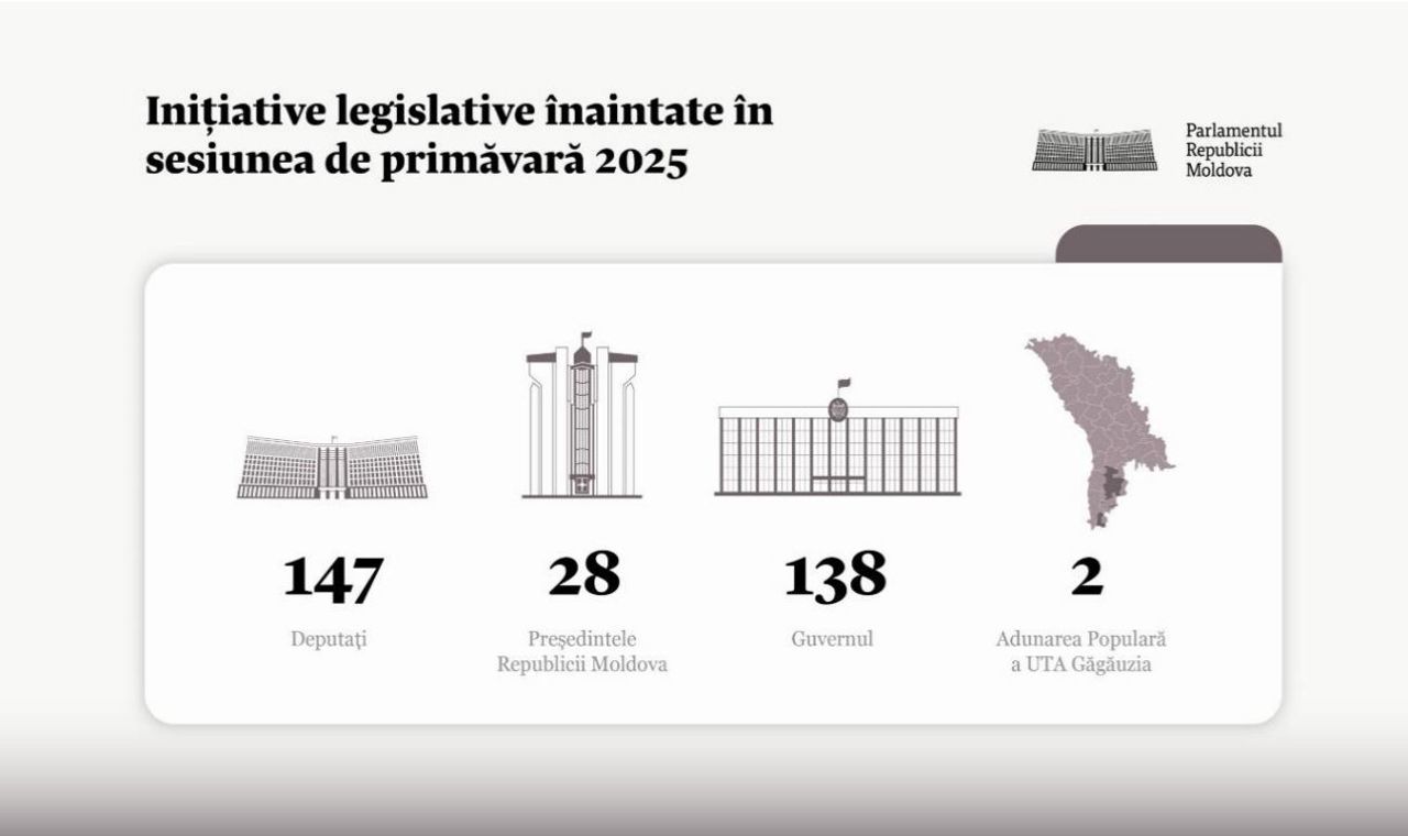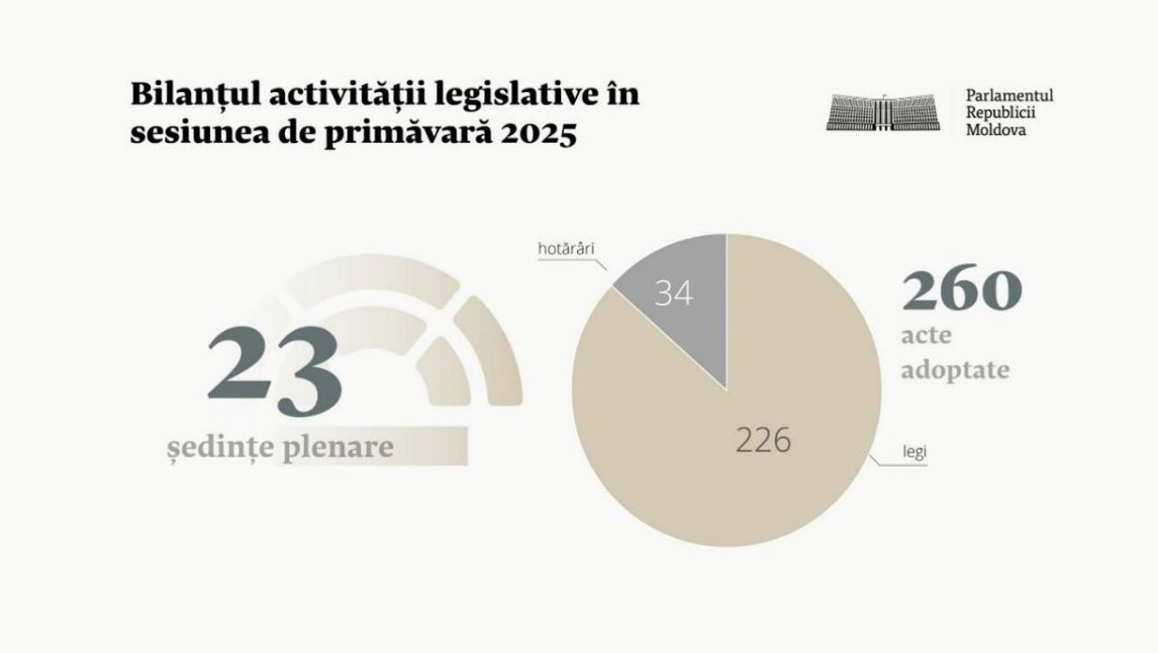 În sesiunea de primăvară 2025, Parlamentul s-a întrunit în 23 de ședințe plenare și a adoptat 260 de acte, dintre care 226 de legi și 34 de hotărâri. Inițiativele legislative au provenit în principal de la deputați (147), Guvern (138) și președintele Republicii Moldova (28).