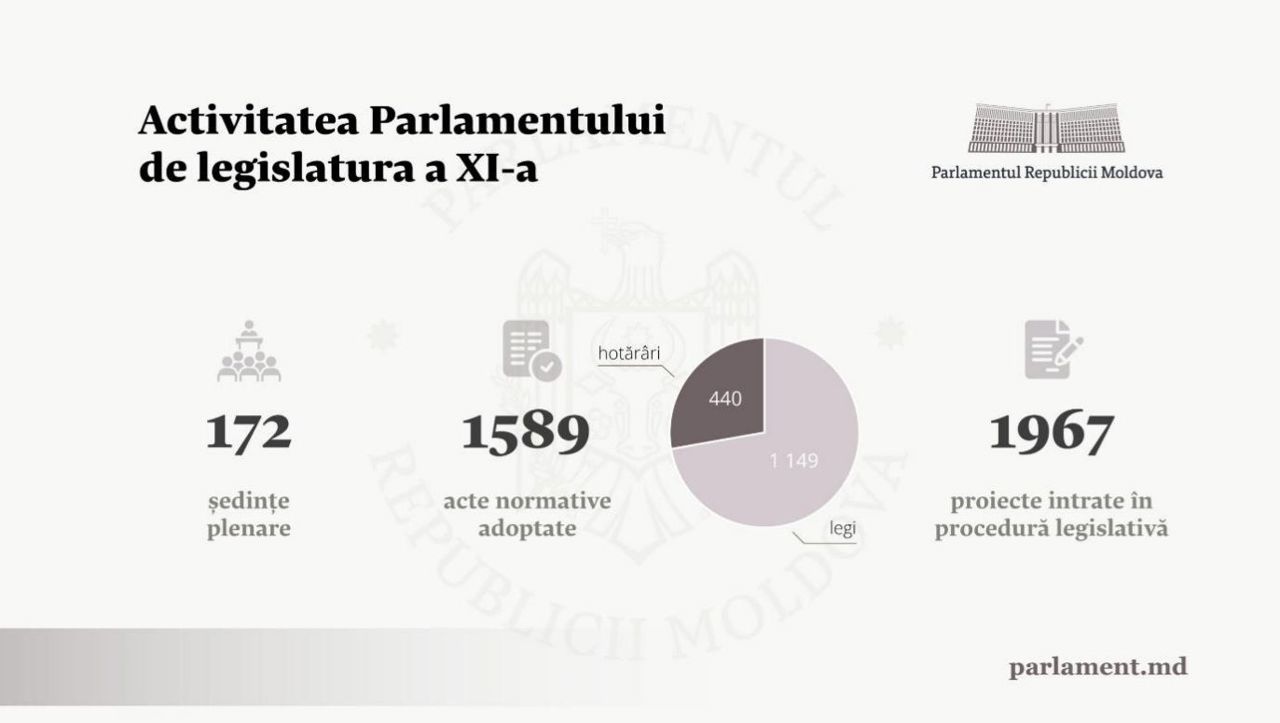 Cea de-a XI-a legislatură a Parlamentului Republicii Moldova, aleasă în iulie 2021, și-a desfășurat activitatea într-un context marcat de crize succesive și de accelerarea parcursului european. Potrivit datelor oficiale, pe durata legislaturii au fost organizate 172 de ședințe plenare, iar Parlamentul a adoptat 1 589 de acte normative, în timp ce 1 967 de proiecte de legi au fost înregistrate în procedura legislativă.