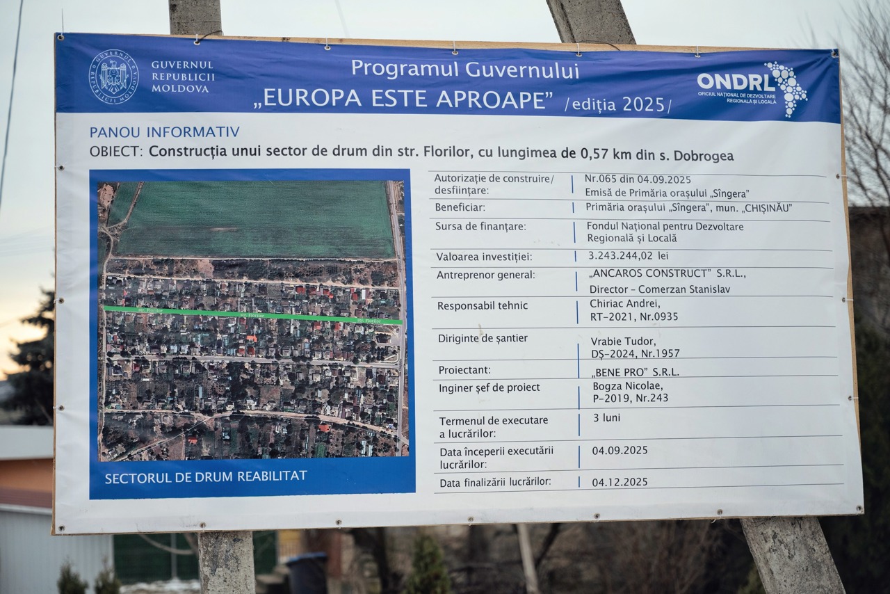 Peste 9.000 de locuitori din satul Dobrogea, orașul Sângera, beneficiază de un drum local modernizat, care îmbunătățește accesul zilnic către locuințe, instituții publice și servicii locale.
