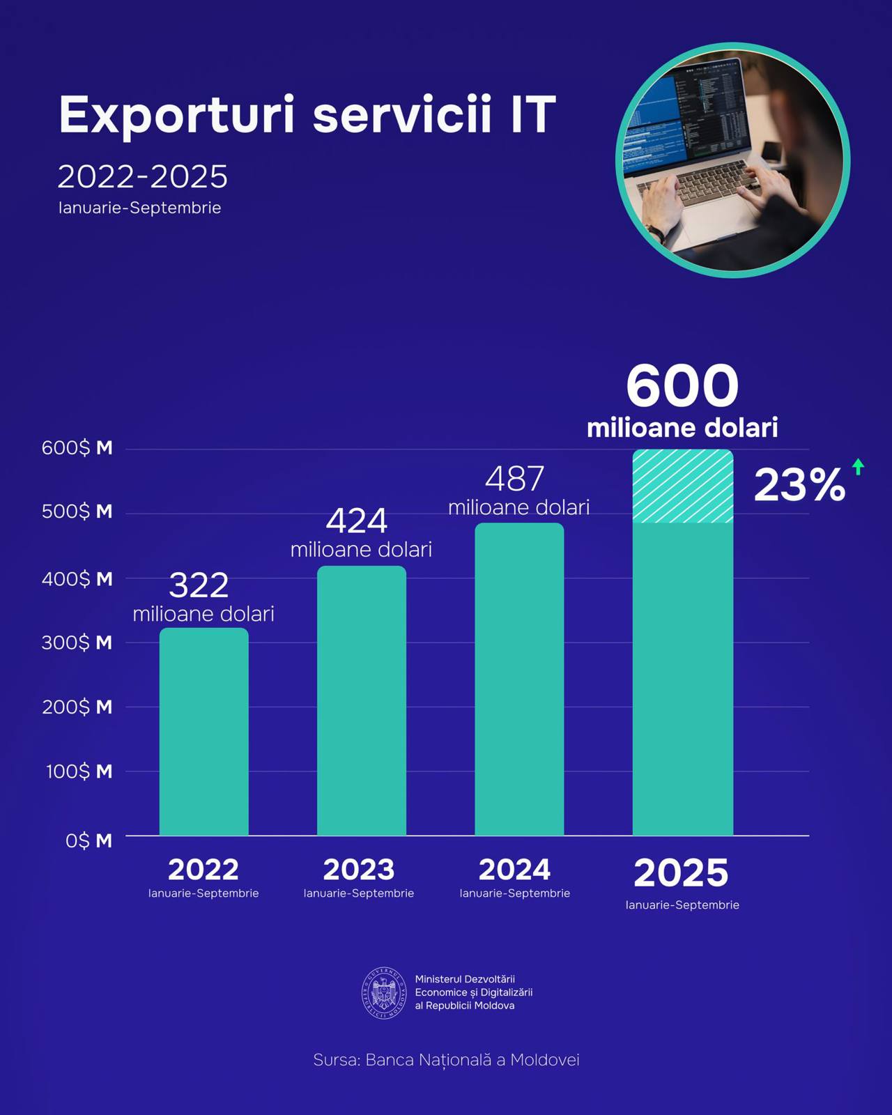 „În perioada ianuarie–septembrie 2025, peste un sfert din exporturile de servicii ale Republicii Moldova au provenit din IT, iar valoarea acestora a depășit 600 milioane USD, înregistrând o creștere anuală de +23%”, se arată în comunicatul publicat de minister pe pagina oficială de Facebook.