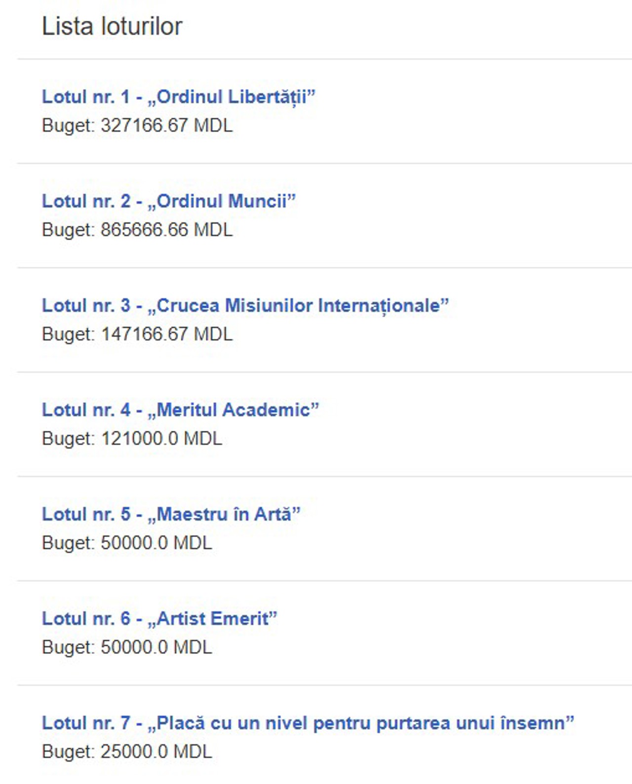 După ce autoritățile au revăzut și actualizat legislația cu privire la distincțiile de stat, Președinția a comandat însemne noi pentru „Ordinul Muncii”, „Ordinul Libertății”, „Maestru în Artă” sau „Crucea Misiunilor Internaționale”, în total șapte distincții, în sumă de aproape 1.6 milioane de lei.