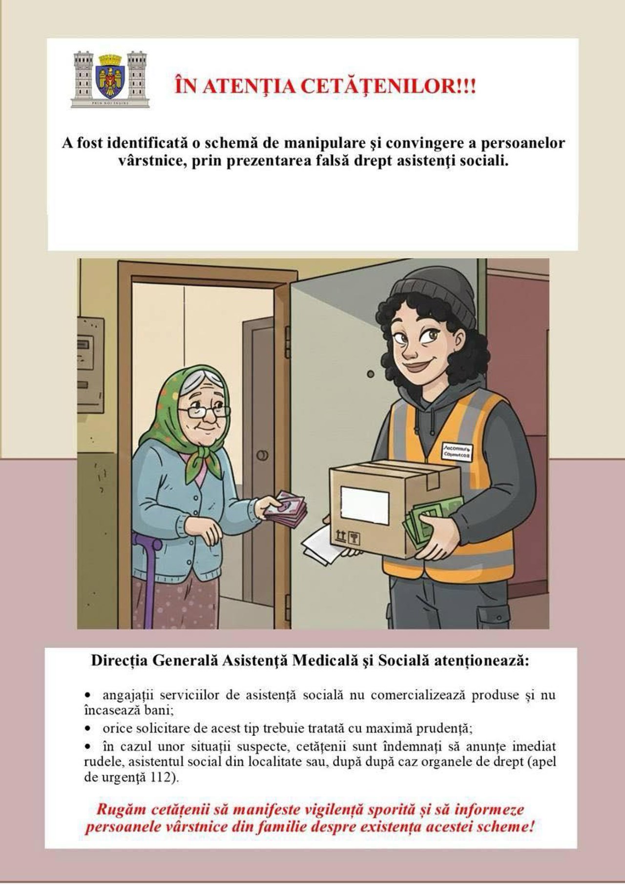 „Rugăm cetățenii să manifeste vigilență sporită și să informeze persoanele vârstnice din familie despre existența acestei scheme, pentru a preveni eventuale situații de înșelăciune”, este îndemnul pentru cetățeni.