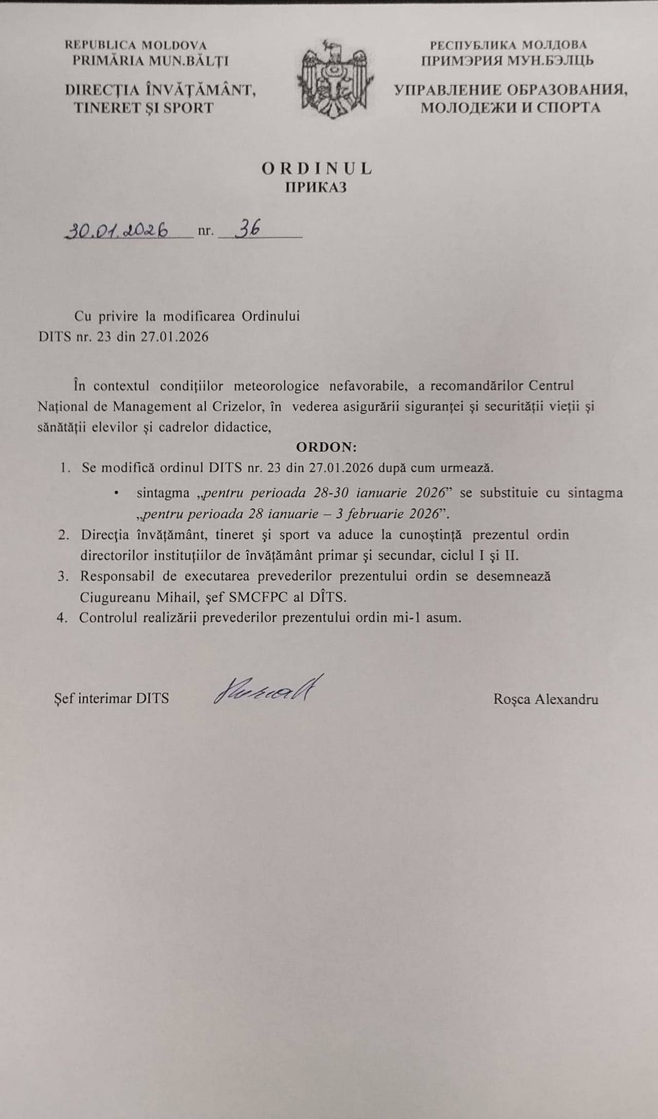 Amintim că, marți, 27 ianuarie, Ministerul Educației și Cercetării a recomandat instituțiilor de învățământ ca activitățile didactice să se desfășoare online, având în vedere condițiile meteorologice dificile și măsurile dispuse la nivel național de Centrul Național de Management al Crizelor. Totodată, pentru școlile în care procesul educațional urma să se desfășoare cu prezență fizică, MEC a sugerat începerea orelor la ora 09:00.