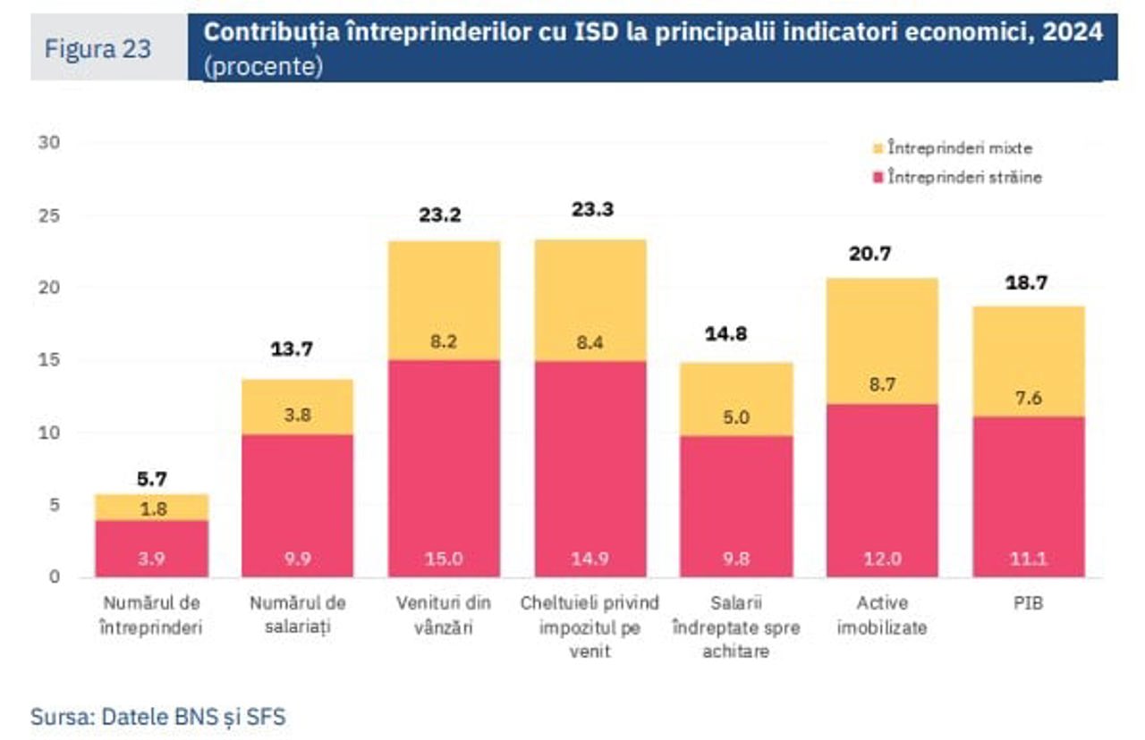 Potrivit aceluiași studiu, deși companiile cu capital străin reprezintă doar 5.7% din numărul total al întreprinderilor din R. Moldova, ponderea lor în indicatorii macroeconomici este disproporționat de mare: