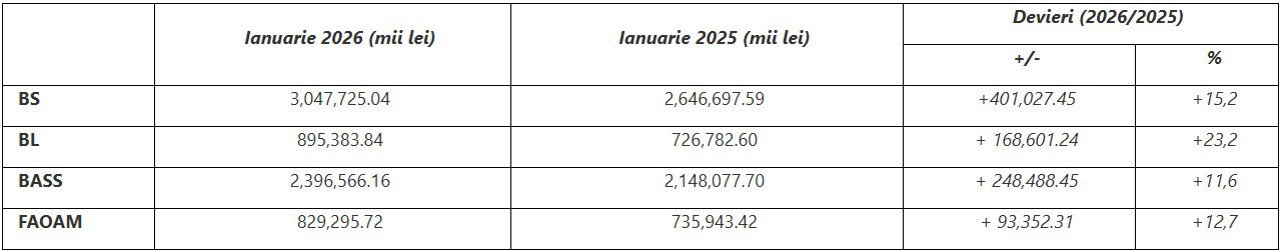 O creștere semnificativă se observă și la bugetele locale. În luna ianuarie 2026, acestea au acumulat aproximativ 895.4 milioane de lei, cu 168.6 milioane de lei mai mult decât în aceeași perioadă din 2025. În termeni procentuali, este vorba despre un salt de 23.2%.