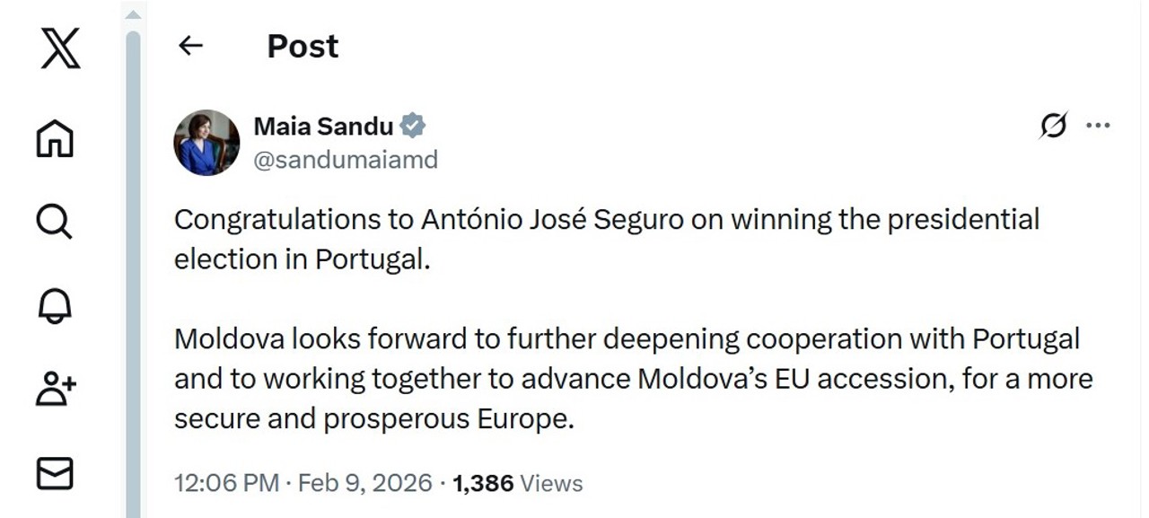 Președinta Republicii Moldova, Maia Sandu, a transmis felicitări lui António José Seguro pentru câștigarea alegerilor prezidențiale din Portugalia, precum și prim-ministrei Japoniei, Sanae Takaichi, pentru rezultatul decisiv obținut de partidul său la scrutinul parlamentar anticipat din 8 februarie.