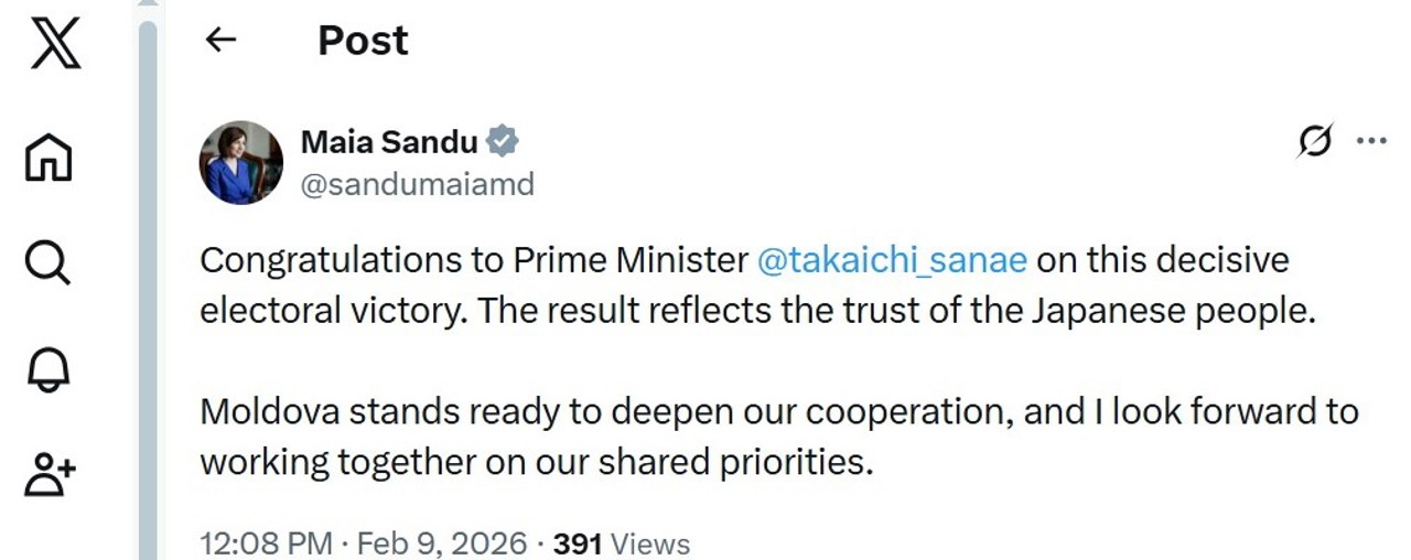 În mesajul adresat prim-ministrei din Japonia, Sanae Takaichi, Maia Sandu a transmis felicitări pentru „victoria decisivă” la scrutinul parlamentar, menționând că rezultatul reflectă încrederea poporului japonez.
