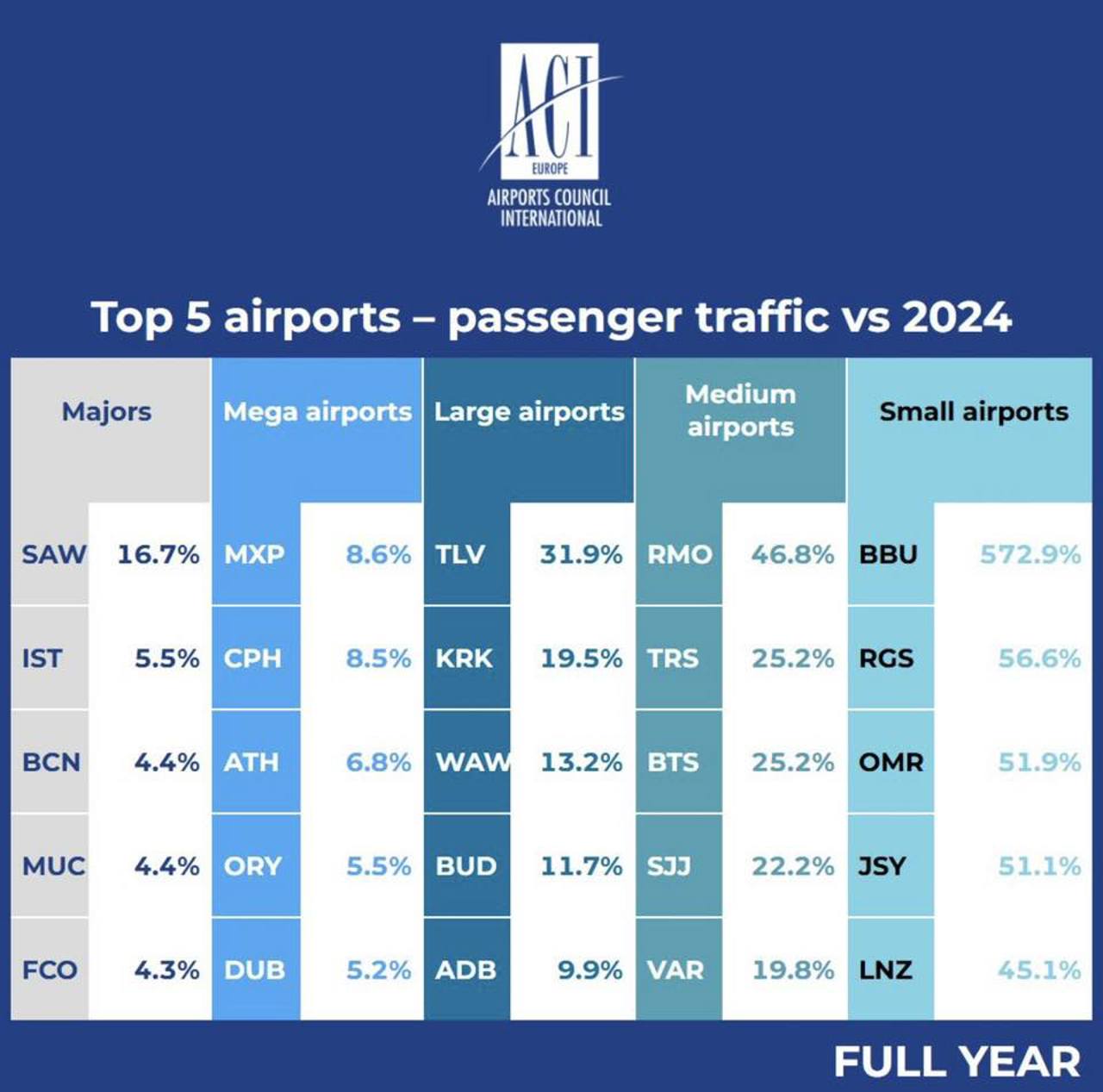 În acest context, Aeroportul Internațional „Eugen Doga” - Chișinău se evidențiază ca unul dintre cele mai dinamice aeroporturi din Europa. Potrivit datelor incluse în raportul ACI EUROPE, Chișinăul ocupă prima poziție în categoria aeroporturilor medii, cu un avans semnificativ față de alte aeroporturi din regiune.