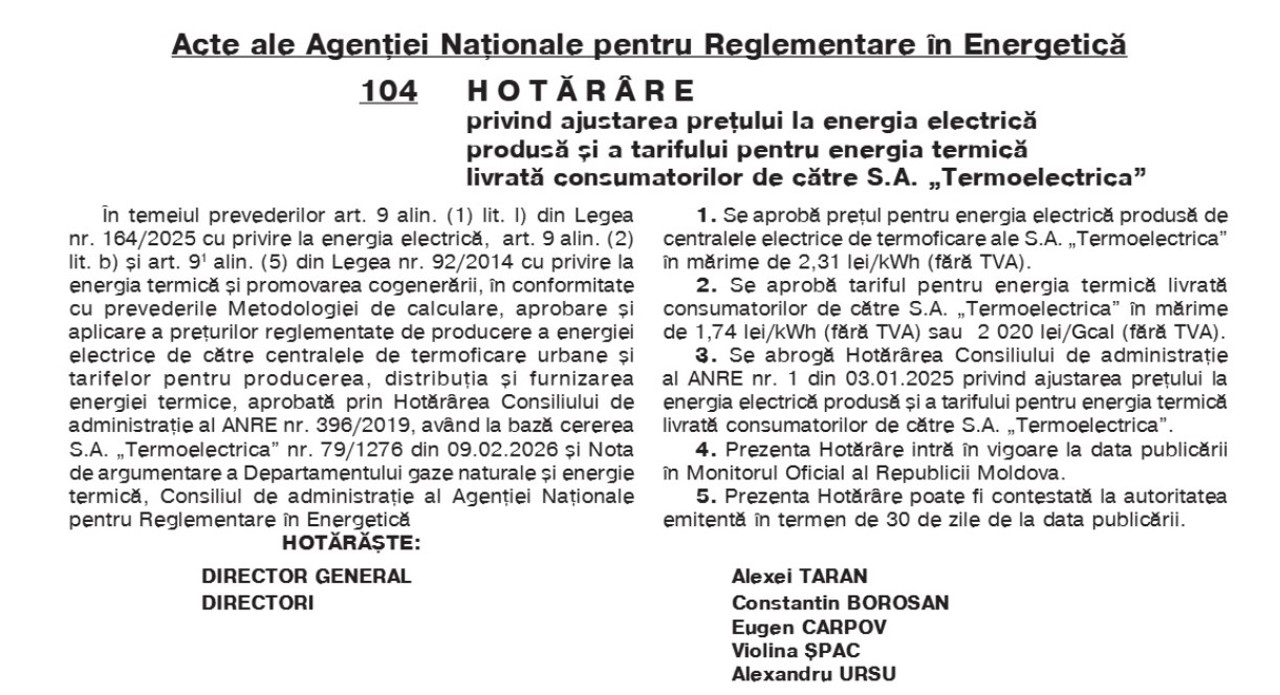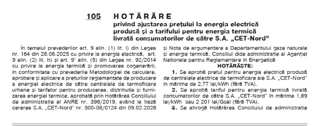 O situație similară se înregistrează și la Glodeni, unde consumatorii vor plăti 2.648 lei/Gcal, cu 443 de lei mai mult decât până acum.