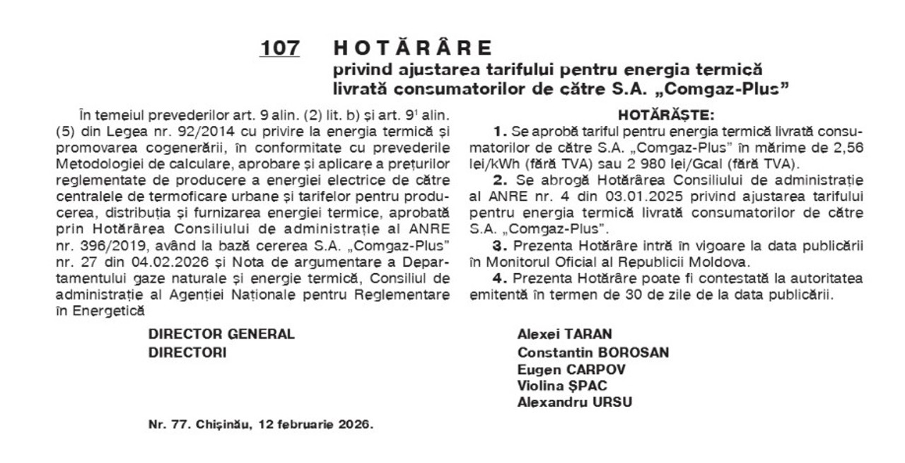 La Ungheni, ANRE a aprobat un tarif de 2.980 lei/Gcal pentru consumatorii deserviți de COMGAZ-PLUS. Iar la Anenii Noi, consumatorii deserviți de întreprinderea municipală „Antermo” vor plăti 2.084 lei/Gcal, tariful fiind mai mic decât până acum.