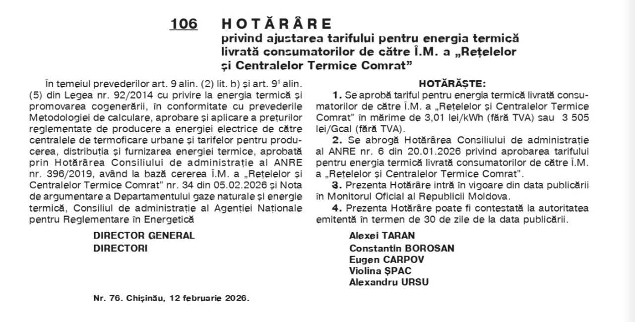 La Comrat, pentru operatorul „Rețele și Centrale Termice”, tariful pentru energia termică a fost stabilit la 3.505 lei/Gcal, ceea ce reprezintă o reducere de aproximativ 240 de lei față de tariful anterior.