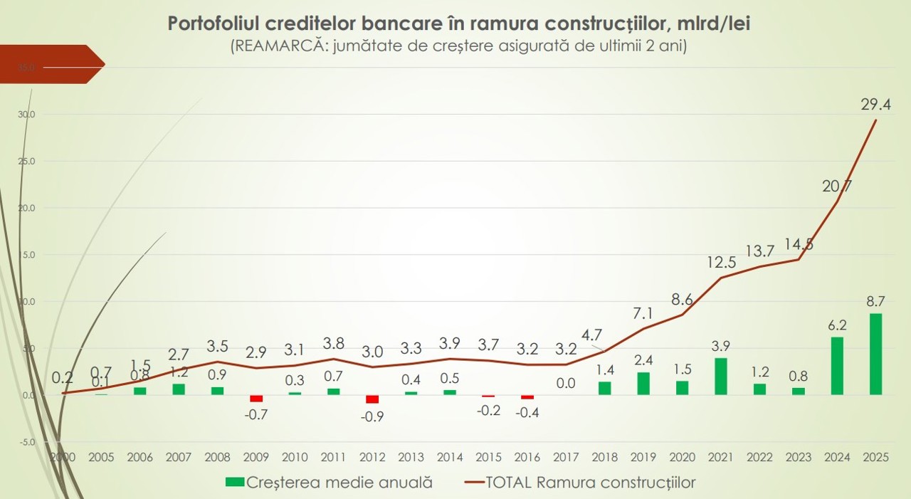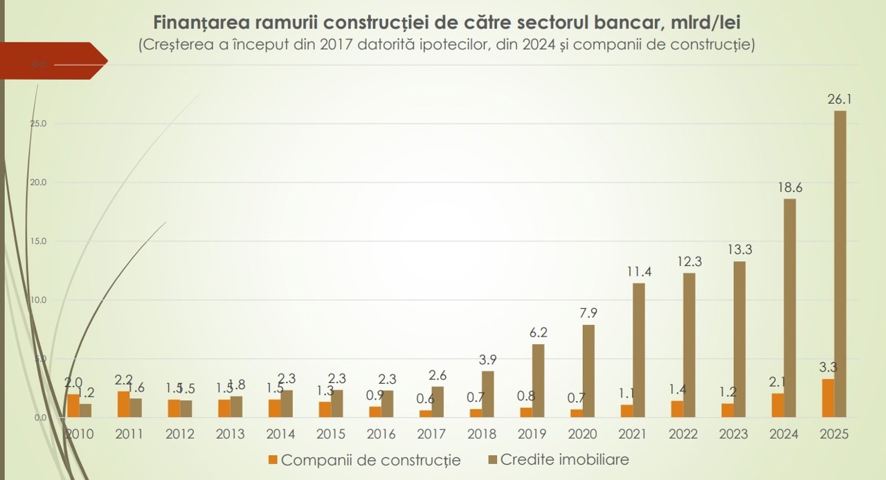 În ultimii zece ani, portofoliul creditelor bancare pentru imobile a crescut semnificativ, de la 3.7 miliarde de lei în 2015 la 29.4 miliarde de lei în 2025, cu o explozie a creditelor ipotecare în ultimii doi ani. Din această sumă însă doar 3.3 miliarde de lei reprezintă creditele acordate companiilor de construcții.