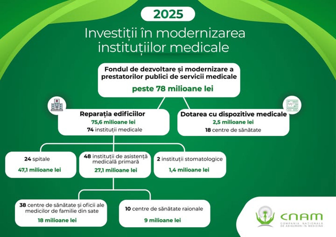The NHIC allocated 75.6 million MDL for the renovation of 74 medical edifices. An additional 2.5 million MDL (approx. €127,000) was invested in high-tech laboratory equipment, physiotherapy tools, and rapid diagnostic devices.