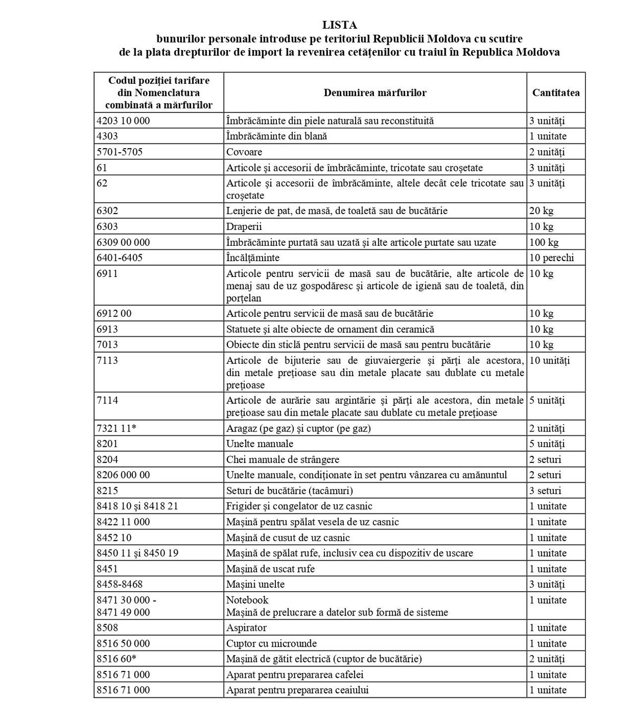 Potrivit listei aprobate, moldovenii care revin cu traiul în țară vor putea aduce, fără a plăti taxe vamale, un televizor, o mașină de cusut, o mașină de spălat vase, o mașină de spălat rufe, un cuptor cu microunde și o cafetieră.