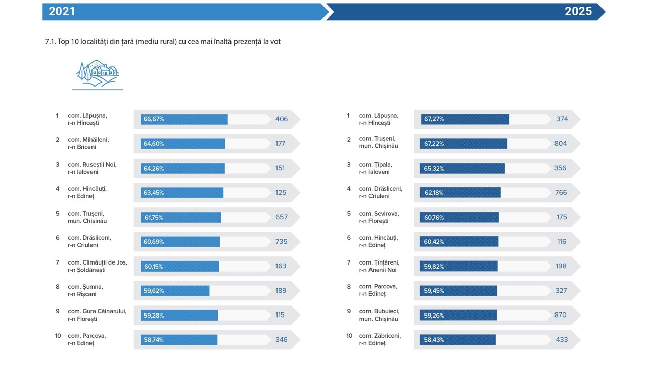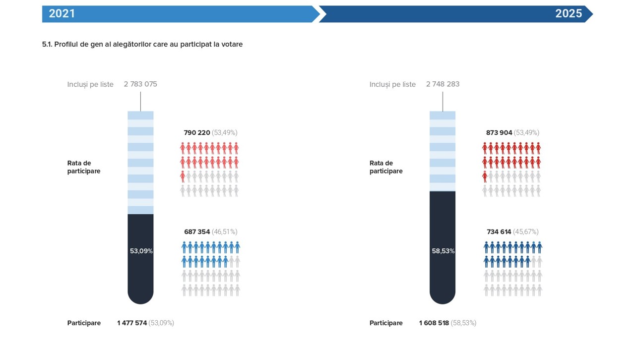 „În ansamblu, analiza comparativă a alegerilor parlamentare din 2021 și 2025 evidențiază progrese în ceea ce privește participarea la vot și consolidarea procesului electoral, însă scoate în evidență și necesitatea unor eforturi continue pentru asigurarea unei reprezentări echilibrate de gen în viața politică”, precizează CEC.