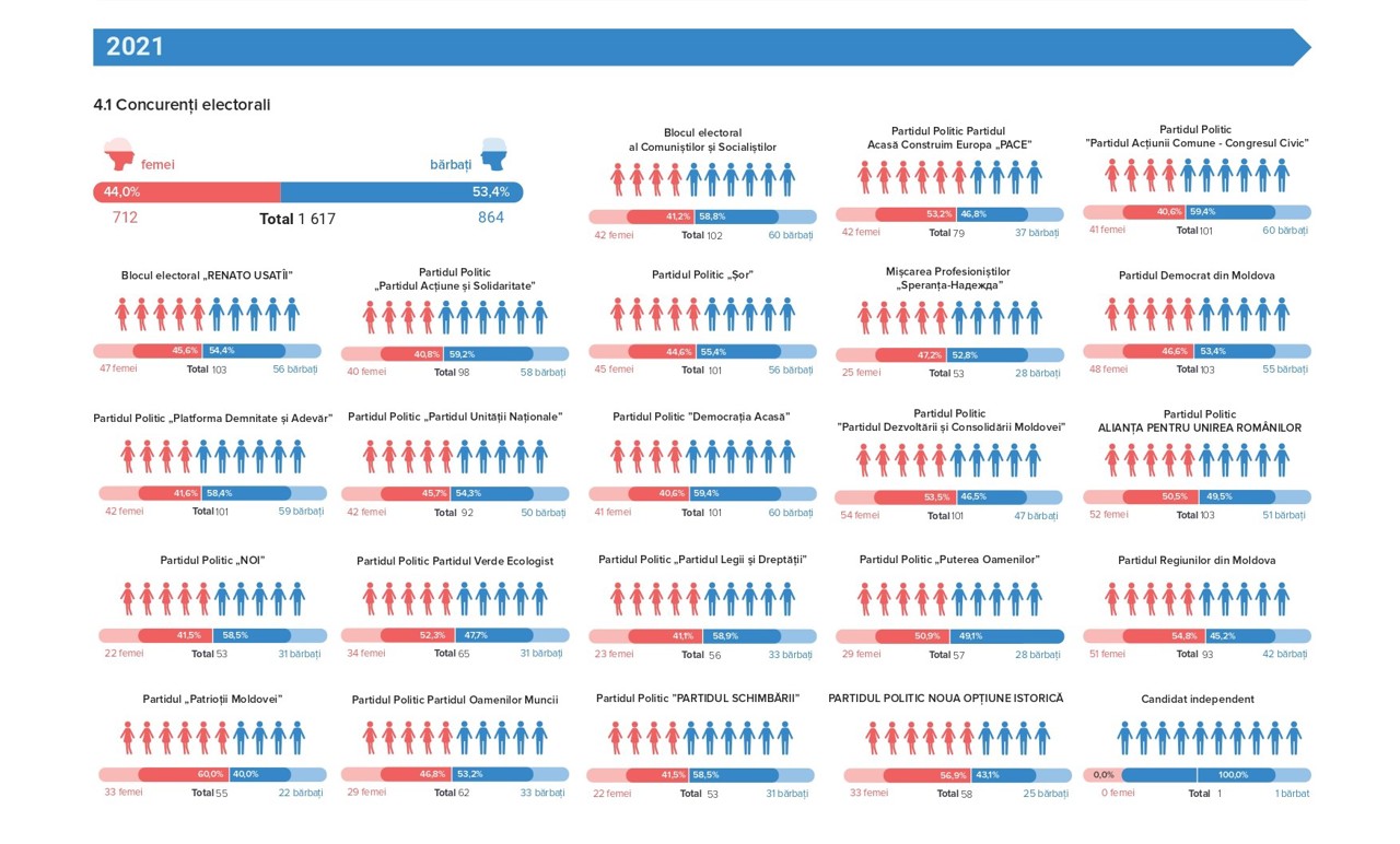 La alegerile parlamentare din 2021 au participat 1.617 concurenți electorali, dintre care 44% au fost femei (712 persoane). În competiția electorală de anul trecut s-au înscris 599 de femei, reprezentând 43.9% din totalul candidaților.