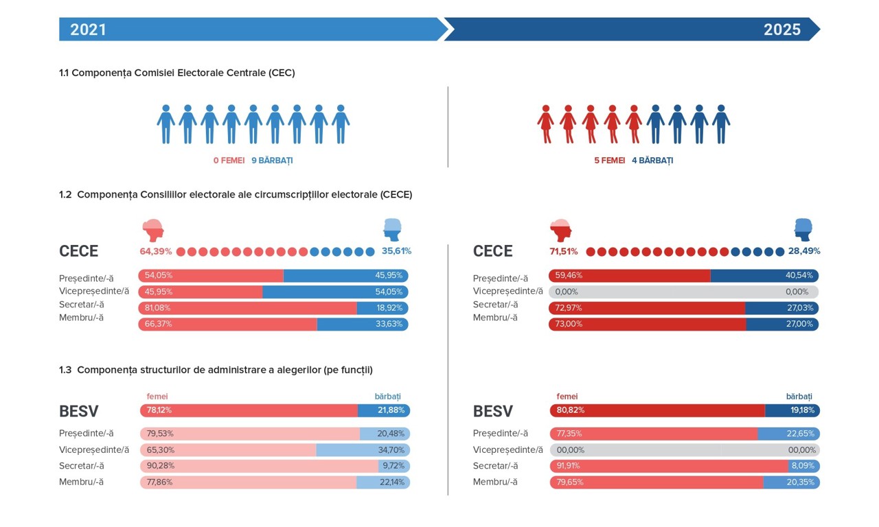 Dacă în 2021 în componența Comisiei Electorale Centrale nu se regăsea nicio femeie, alegerile din 2025 au fost organizate de o autoritate formată din patru bărbați și cinci femei, inclusiv președinta Angelica Caraman.