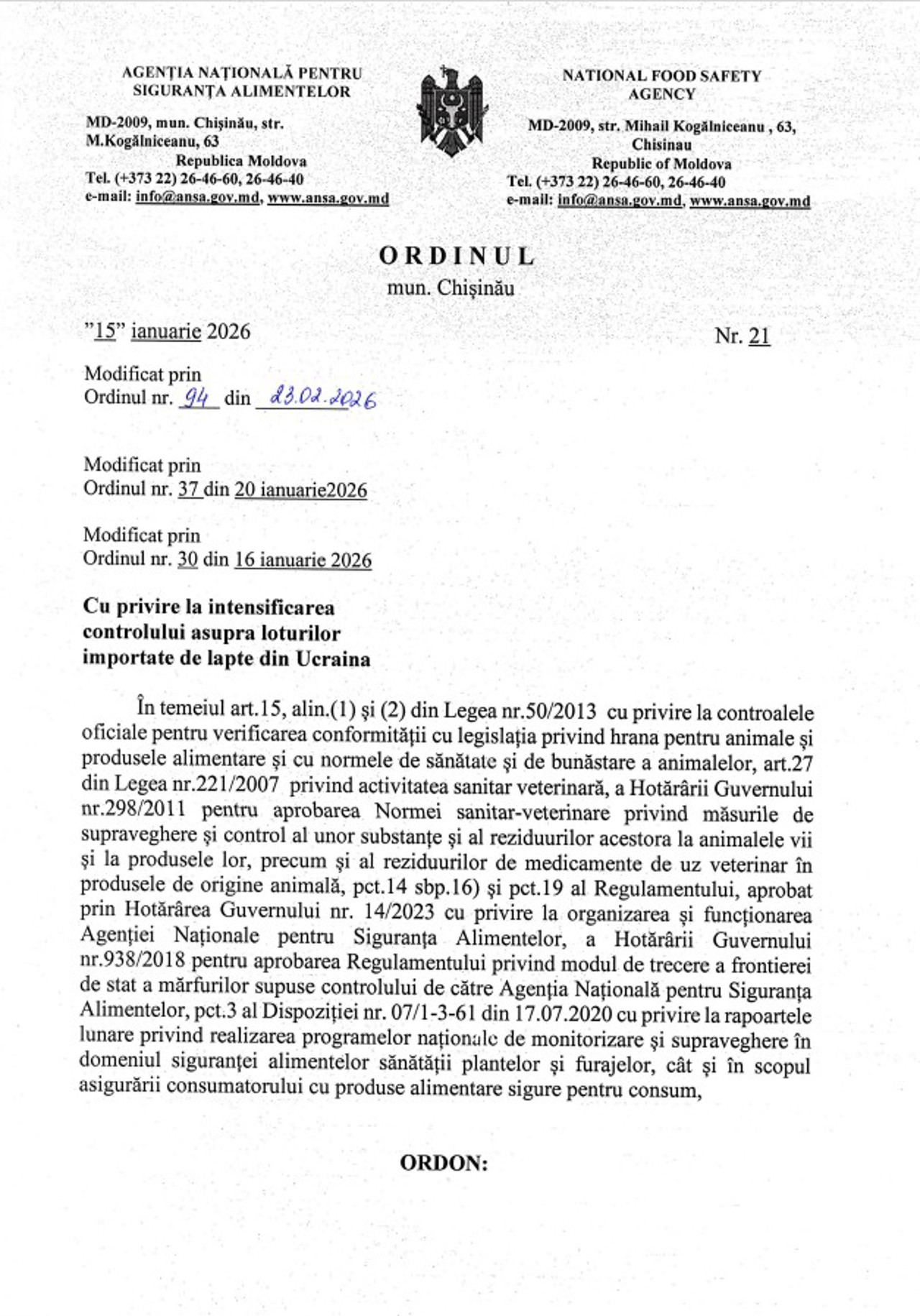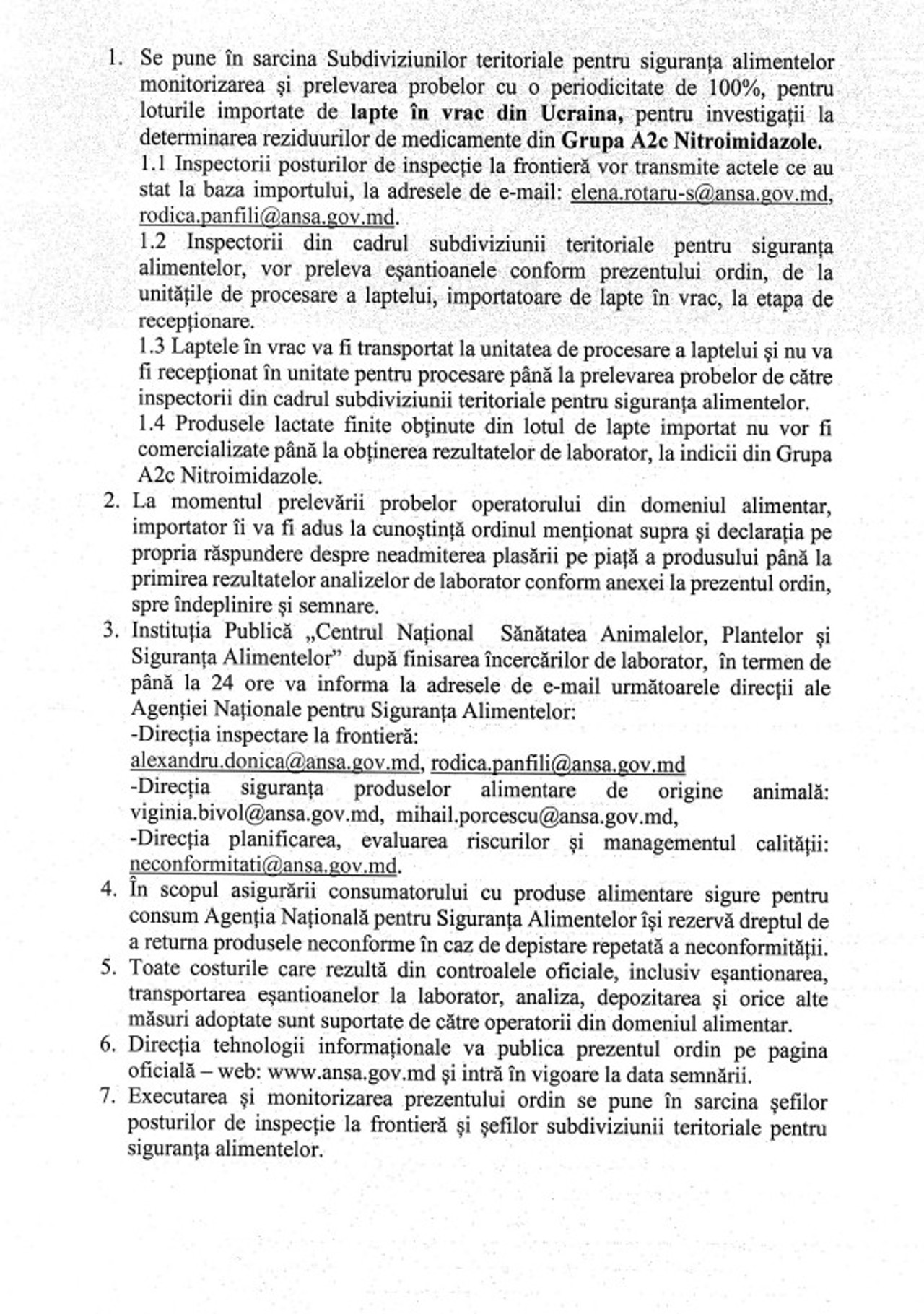 Under an order signed by the general director of the institution, Radu Musteața, ANSA has decided that every batch of milk imported from the neighboring country will undergo full inspection.