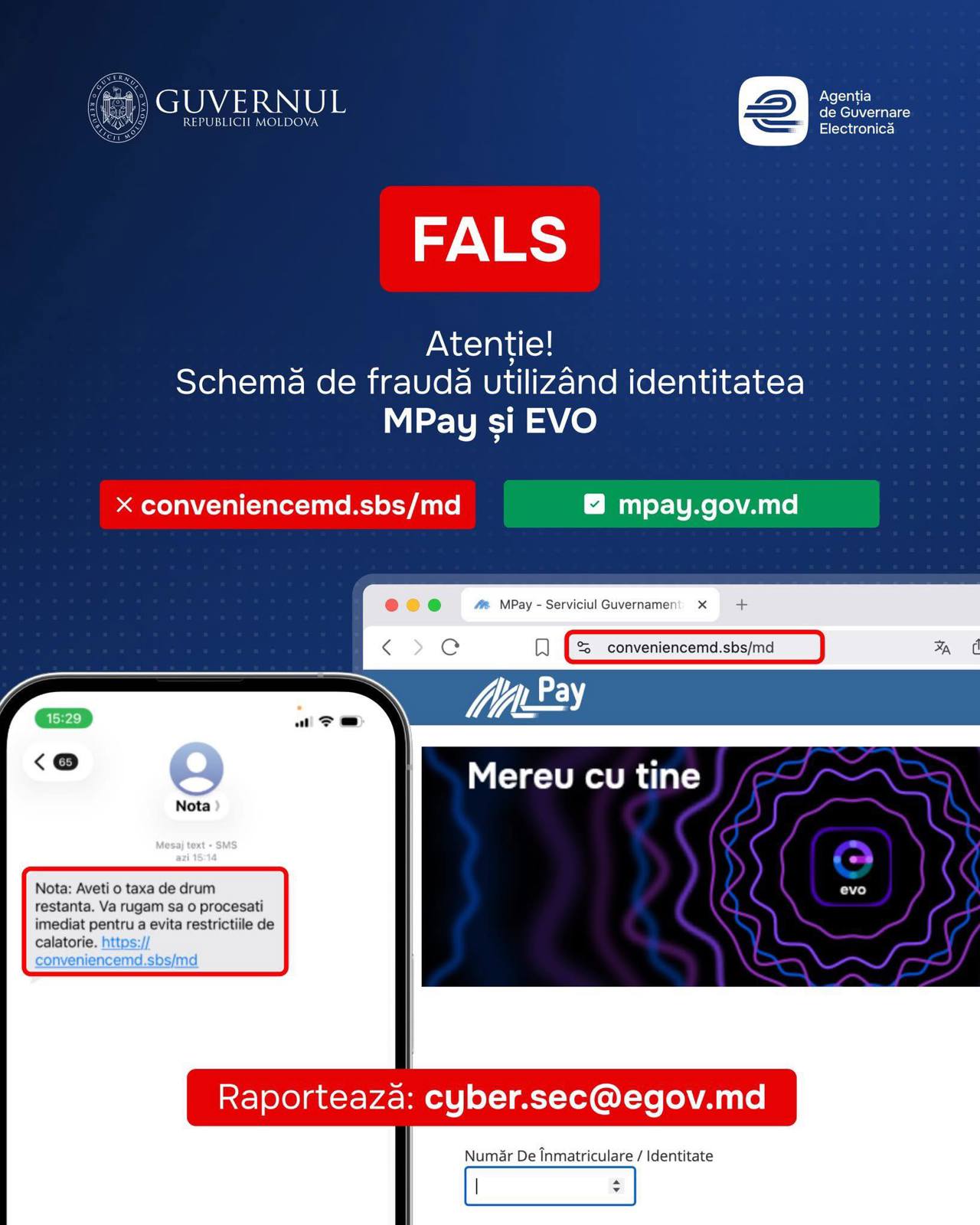 Autoritățile avertizează că a fost identificată o schemă de fraudă care utilizează în mod ilegal identitatea MPay și EVO. Cetățenii primesc mesaje SMS privind o pretinsă „taxă de drum restantă” și sunt îndemnați să acceseze un link.