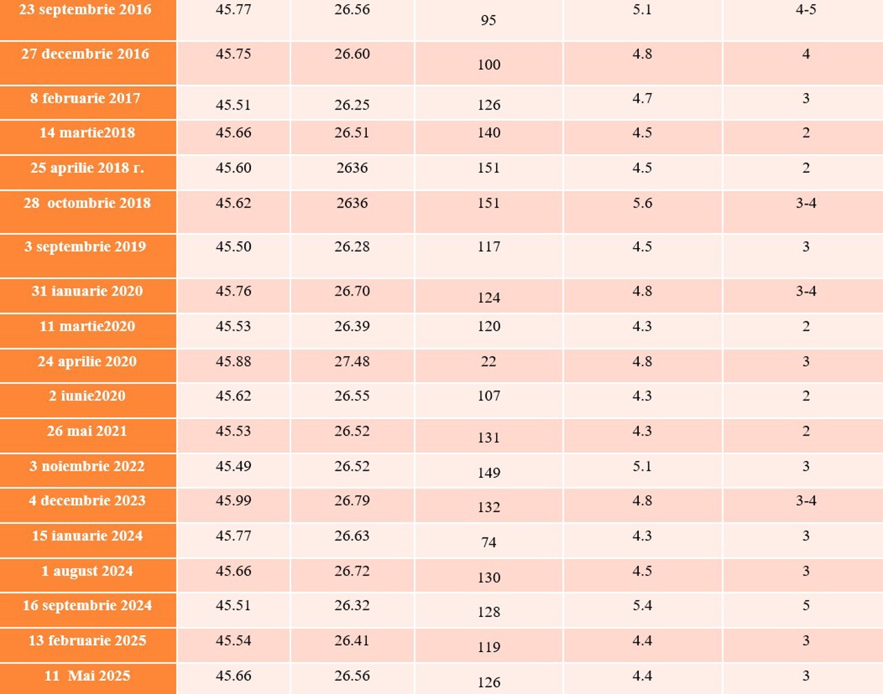 Cutremure resimțite pe teritoriul Republicii Moldova în anii 2014 – 2025: