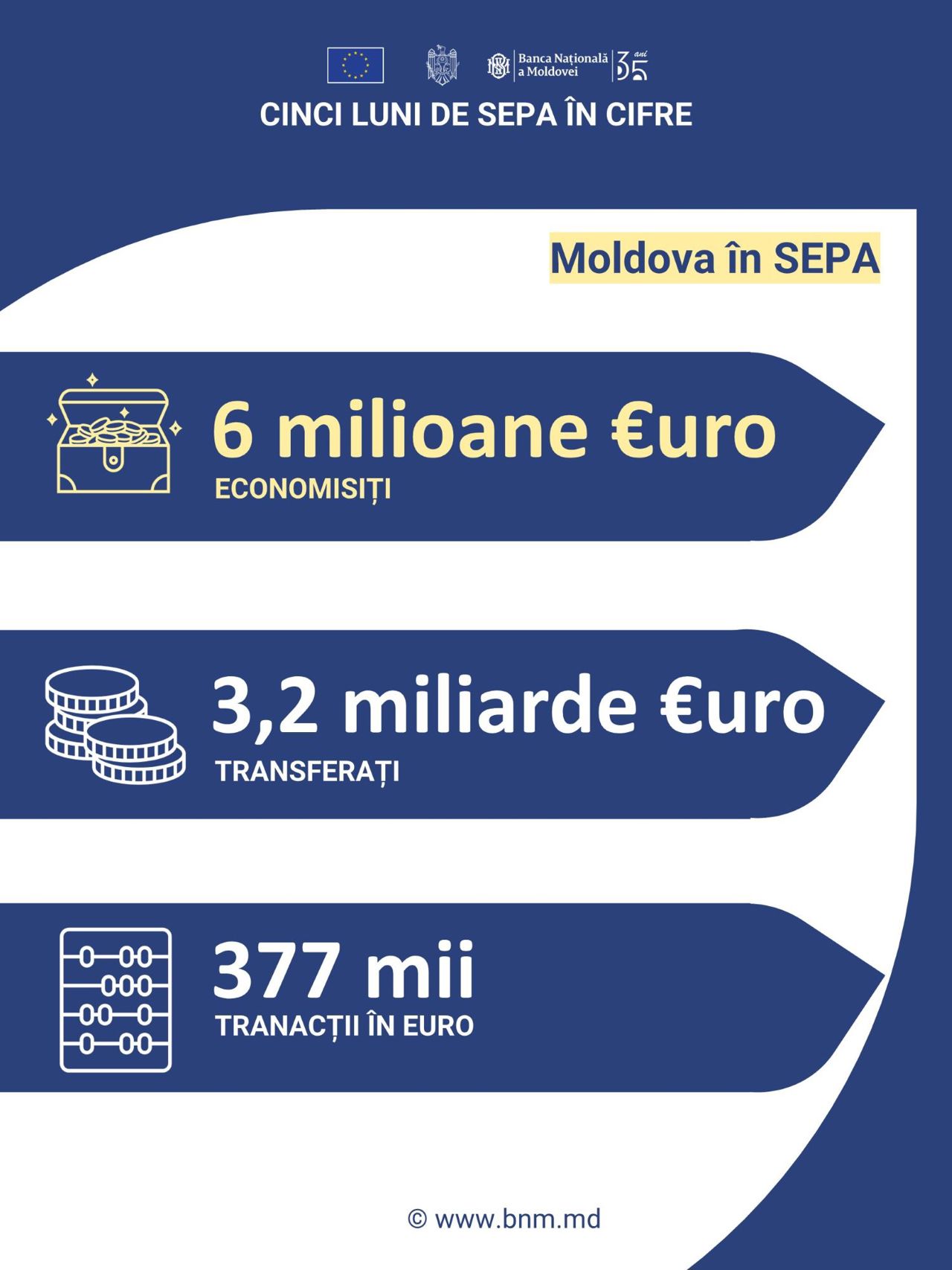 Cele peste 377 de mii de transferuri realizate de la conectarea Republicii Moldova la SEPA ar fi costat economia națională 6.6 milioane de euro în sistemul tradițional SWIFT. Prin SEPA, costurile au fost de 474 de mii de euro, ceea ce înseamnă că 6.11 milioane de euro au rămas în bugetul moldovenilor, potrivit estimărilor BNM.