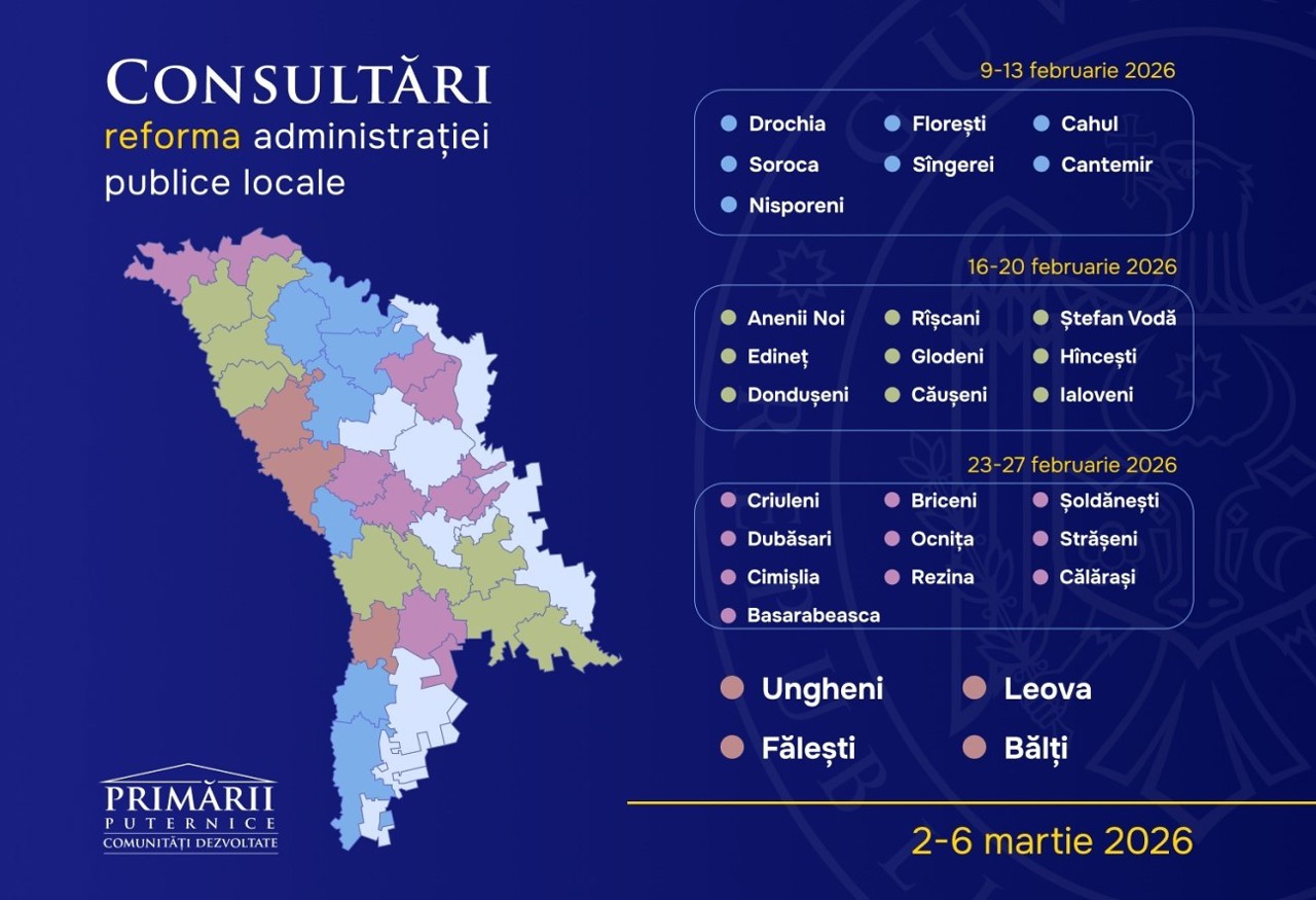 The government will hold consultations next week regarding local public administration reform in Orhei, Telenești, and Taraclia. This concept will also be discussed in Gagauzia Autonomous Region and Chisinau municipality.