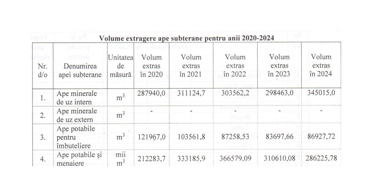 Volumul extras a scăzut de la 121.967 de metri cubi în 2020, la 83.697 de metri cubi în 2023. În 2024, au fost extrase aproape 87 de mii de tone de apă.