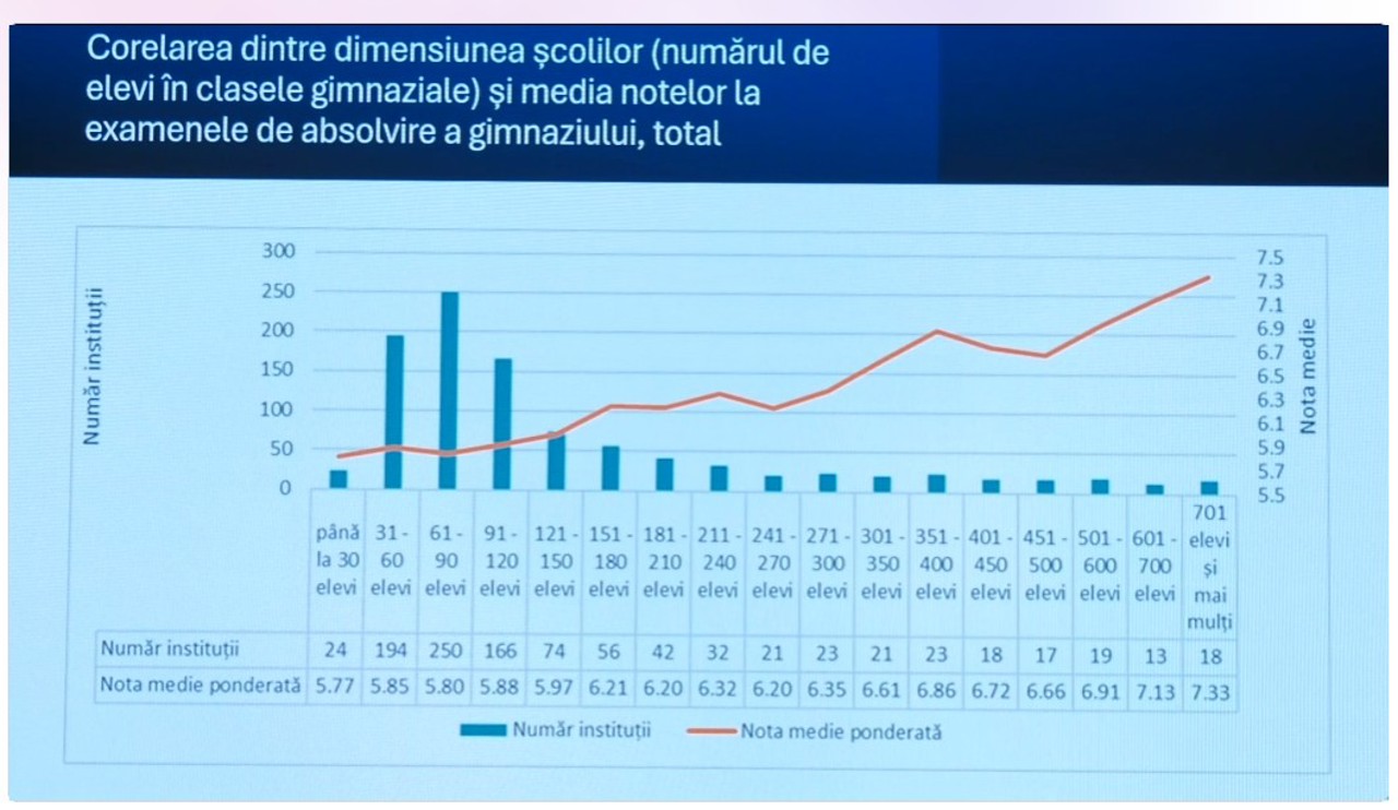 Studiul evidențiază și discrepanțe semnificative în calitatea educației. În școlile mari, cu peste 700 de elevi, media notelor la absolvirea gimnaziului este de 7.3, în timp ce în instituțiile foarte mici aceasta scade la 5.9.