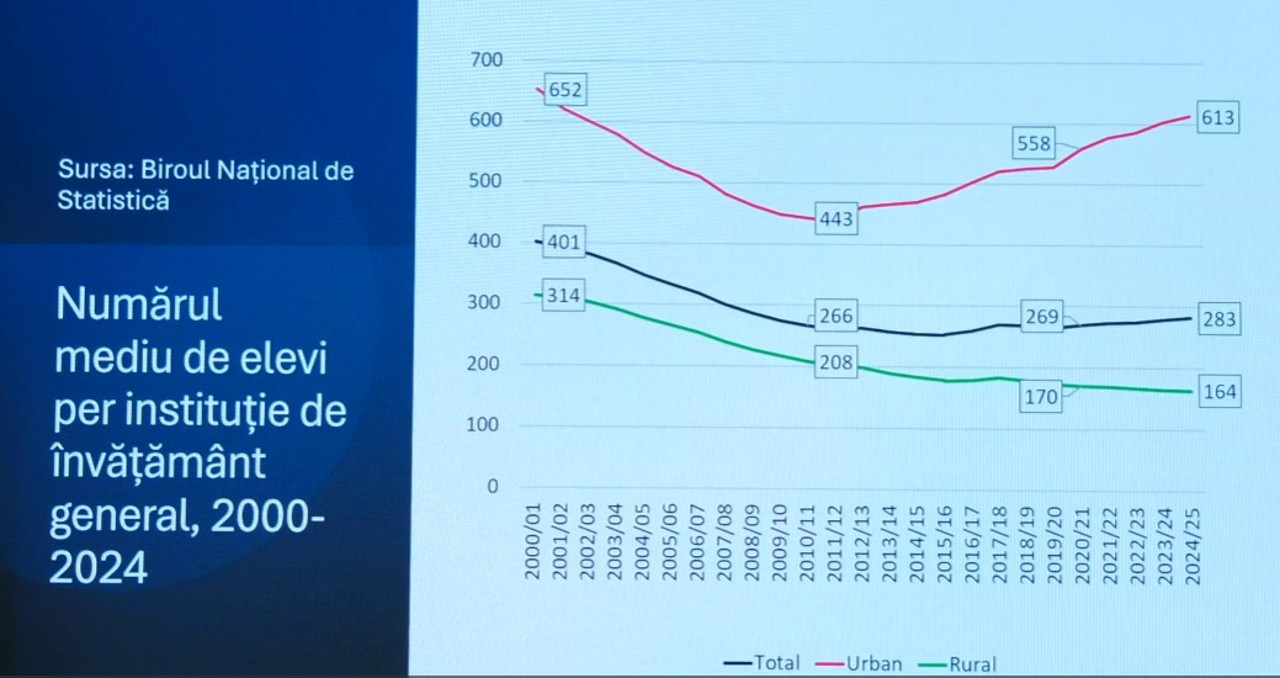 Datele prezentate arată un declin constant al numărului de școlari. Din anul 2000 până în 2024, numărul elevilor a scăzut cu aproximativ 100.000, iar în mediul rural descreșterea este de circa 45%. Cauzele principale sunt migrația și scăderea natalității.