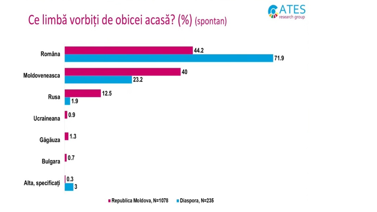 Regarding language use, 44.2% of respondents in the Republic of Moldova reported speaking Romanian, while 40% reported speaking Moldovan. Unlike the census results, those who claim to speak Romanian are now in the majority. In the diaspora, this percentage is even higher, estimated at about 72%.