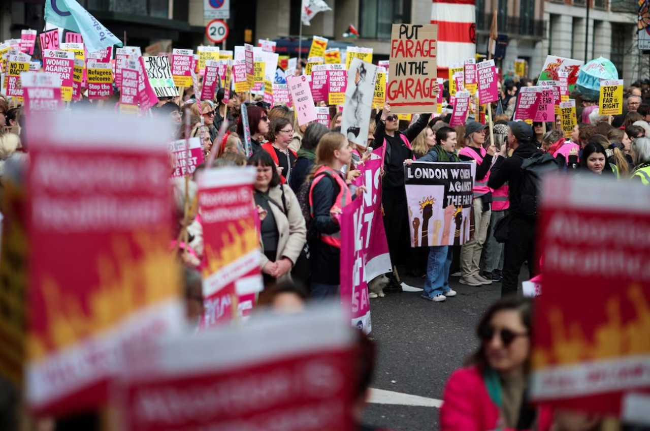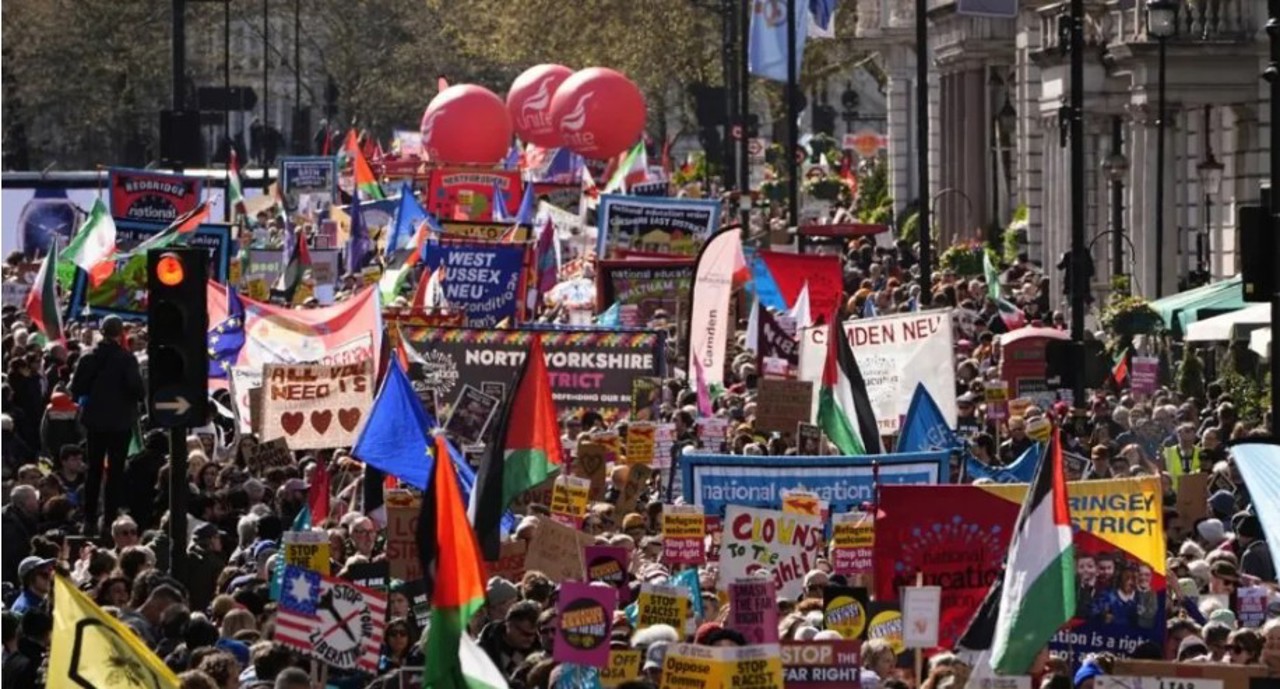 Numeroase persoane au participat sâmbătă, 28 martie, la un protest în centrul Londrei împotriva extremei drepte, organizat de Together Alliance, pe fondul tensiunilor legate de discursul anti-imigrație și mobilizarea grupărilor radicale.