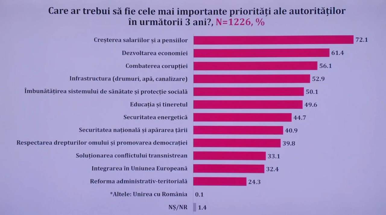 Potrivit cercetării, peste 72% dintre respondenți consideră că majorarea salariilor și pensiilor ar trebui să fie principala prioritate a autorităților. Urmează dezvoltarea economiei - 61.4% și combaterea corupției - 56%.