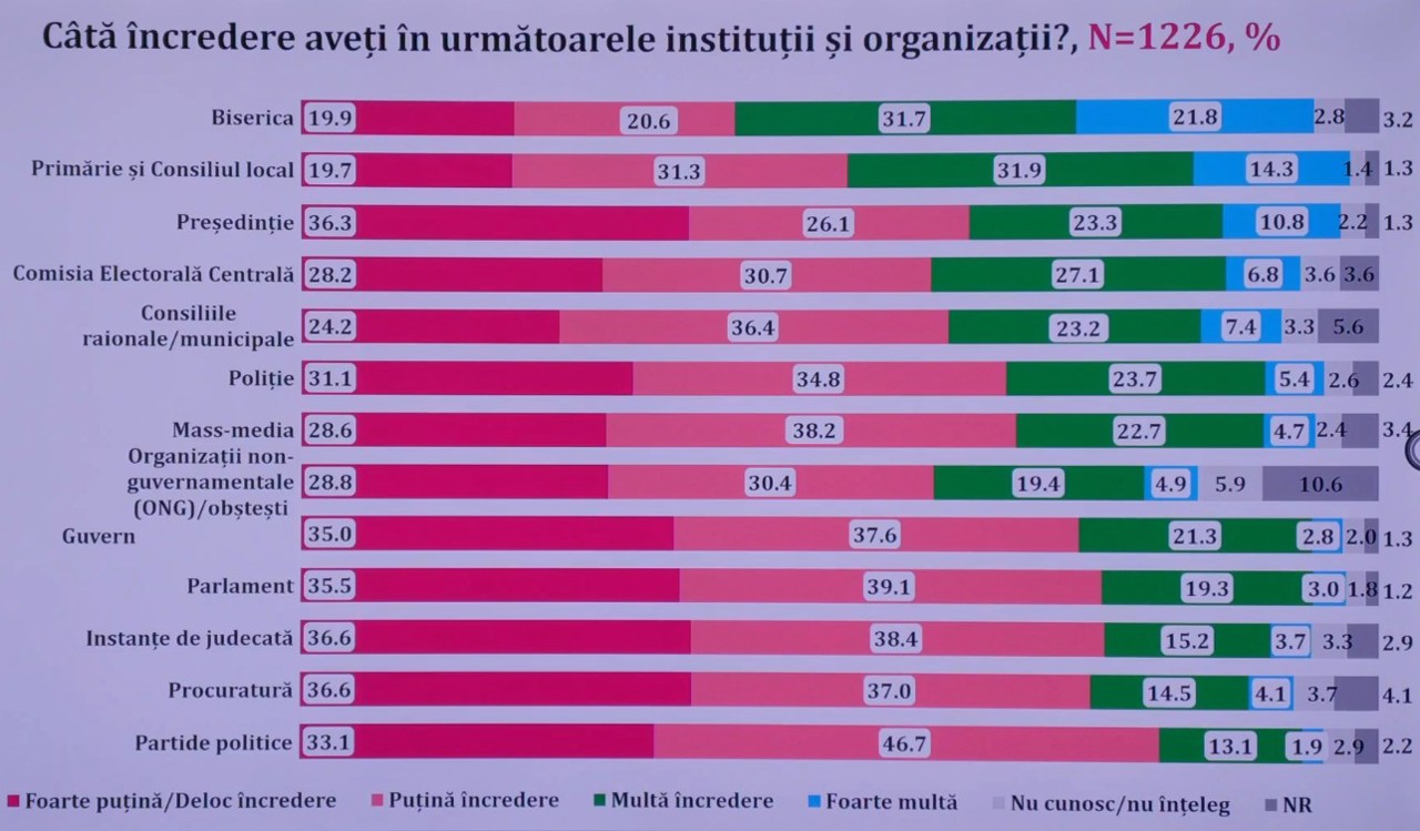 „Observăm că, în topul încrederii, în continuare se află biserica, iar pe ultimul loc - partidele politice, care se bucură de foarte multă încredere și multă încredere din partea a doar circa 15% din respondenți. 33% au foarte puțină încredere sau deloc, iar 46.7% - puțină încredere în partide”, a precizat Nicolae Panfil.