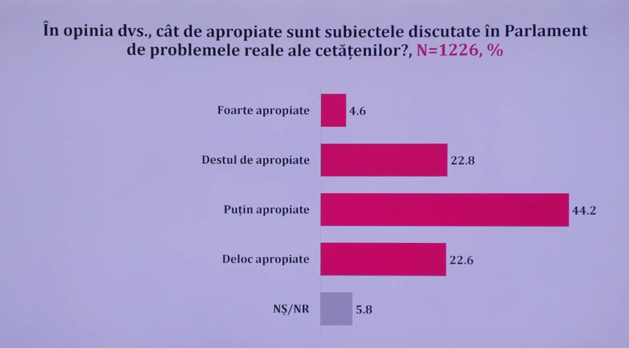 Doar aproximativ 27% din respondenți consideră că subiectele discutate sunt apropiate de problemele reale, iar peste 60% - că acestea sunt puțin sau deloc relevante.